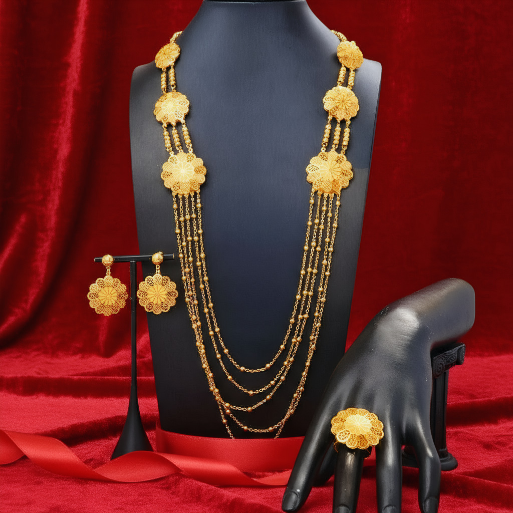 3-Piece Middle Eastern Geometric Tassel Long Necklace, Earrings, and Ring Jewelry Set, Dubai Women's Wedding Accessories