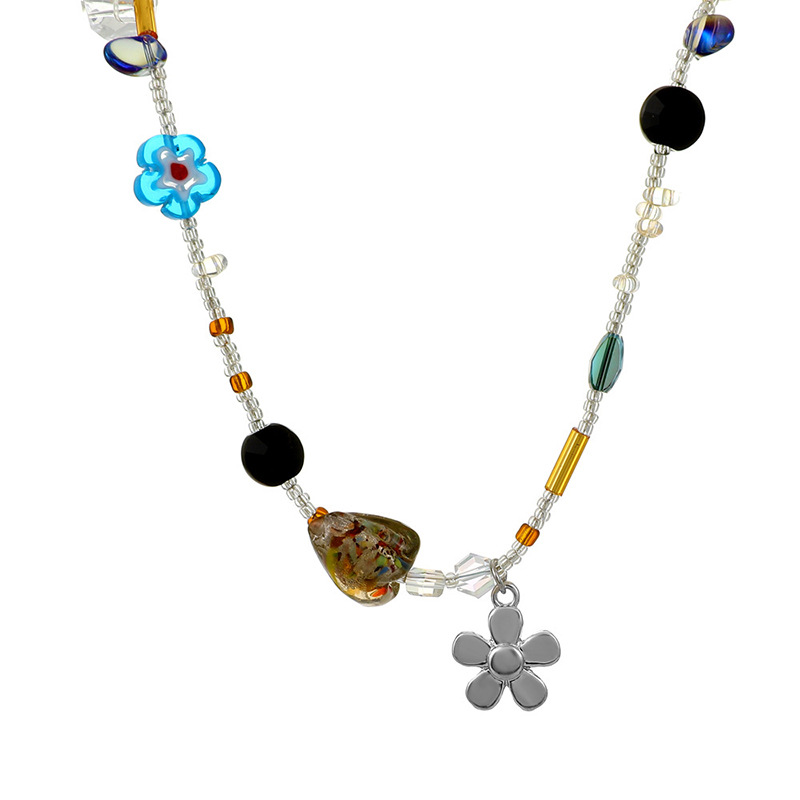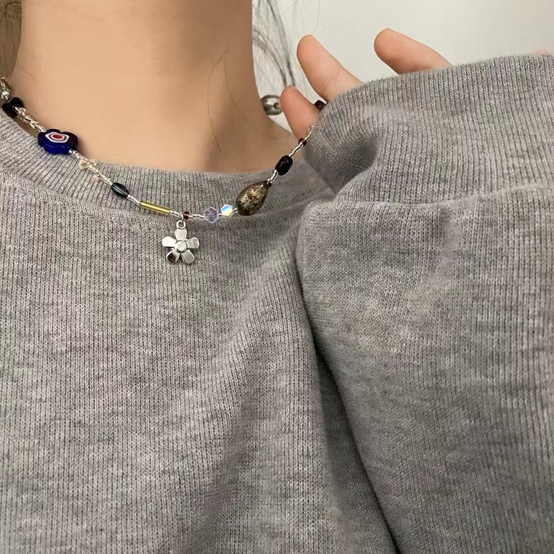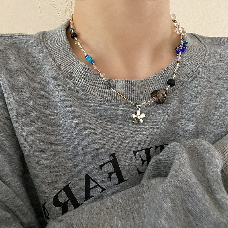 Unique Trendy Sweet Cool Style Tassel Flower Crystal Crushed Stone Beaded Forest Necklace Glass Flower Choker Collarbone Chain
