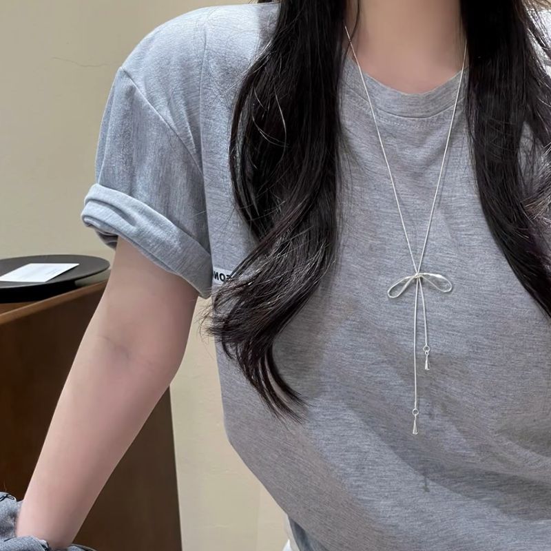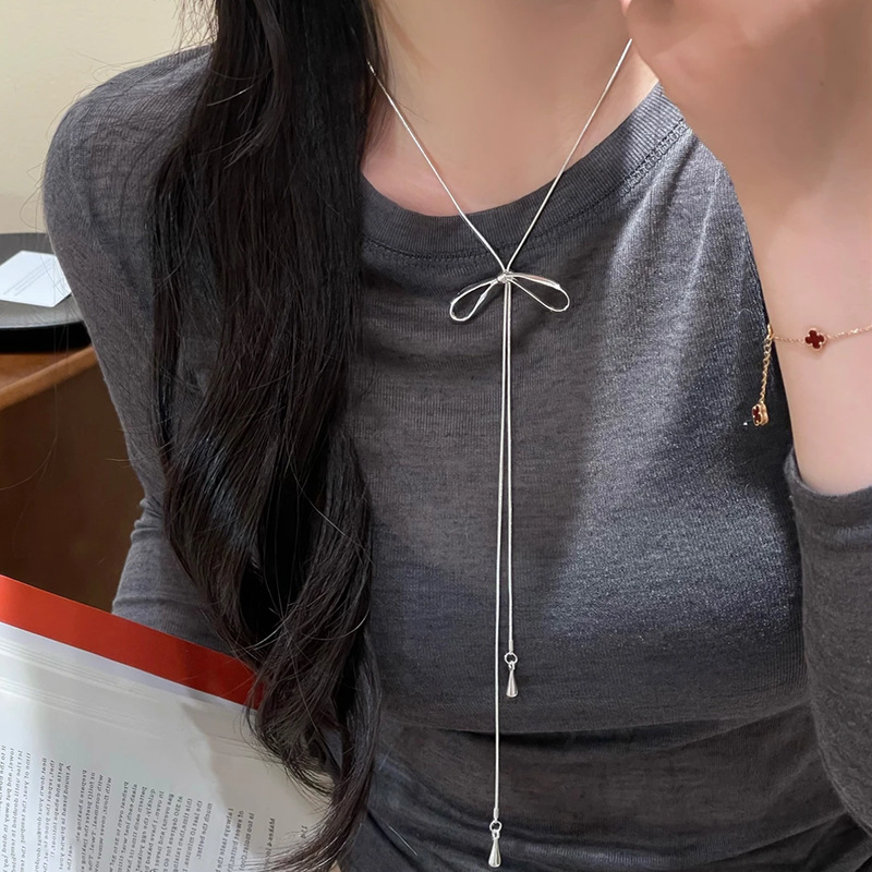 Silver Long Pull-Out Bow Tassel Necklace for Women 2025 New Trendy Elegant Versatile Design Clavicle Chain