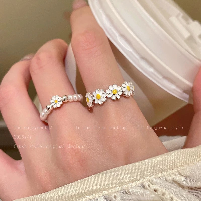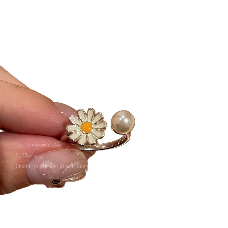 Little Daisy Pearl Ring for Women, Simple and Sweet Fresh Open Ring, Niche Design for Stacking on the Index Finger