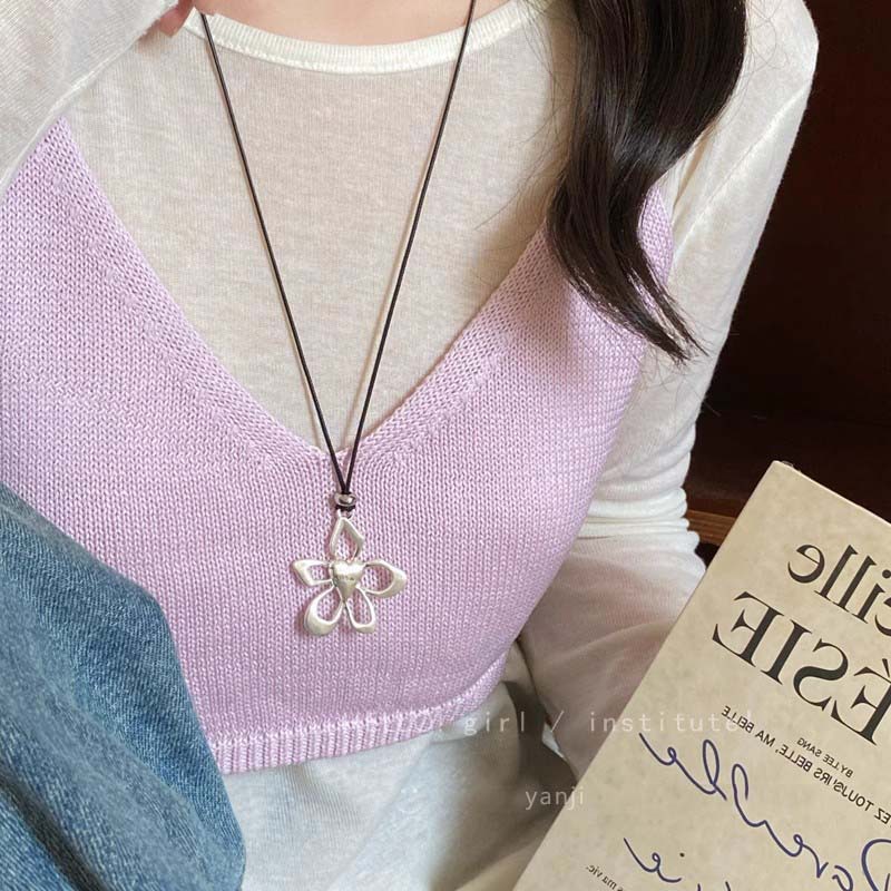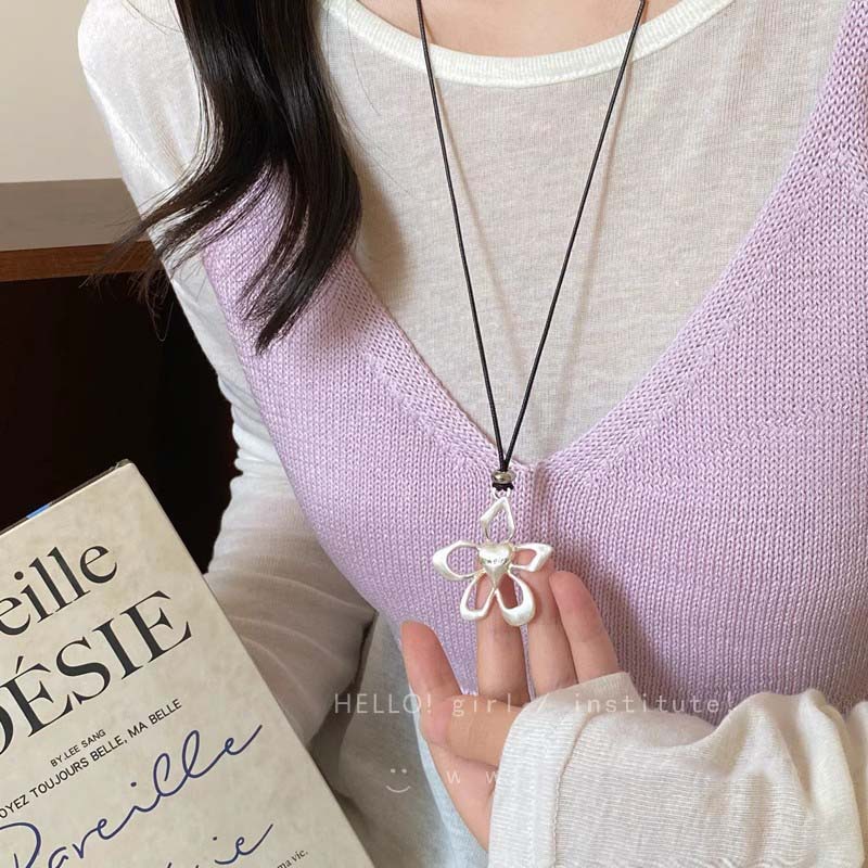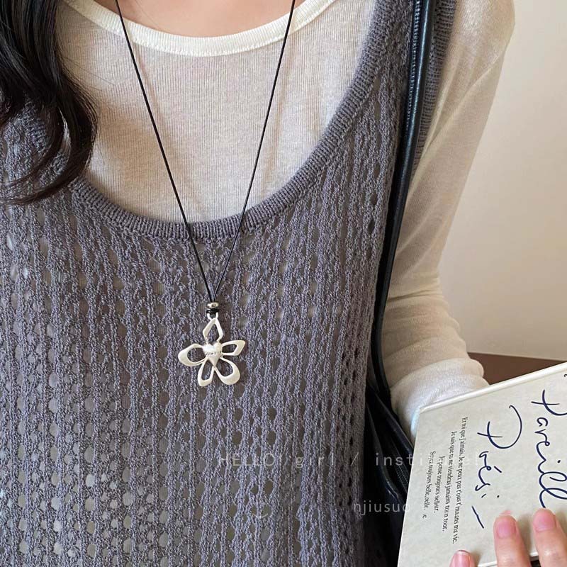 Korean Ins Blogger Cut Out Flower Pendant Necklace Women's High-End Black Rope Pull Adjustable Long Sweater Chain