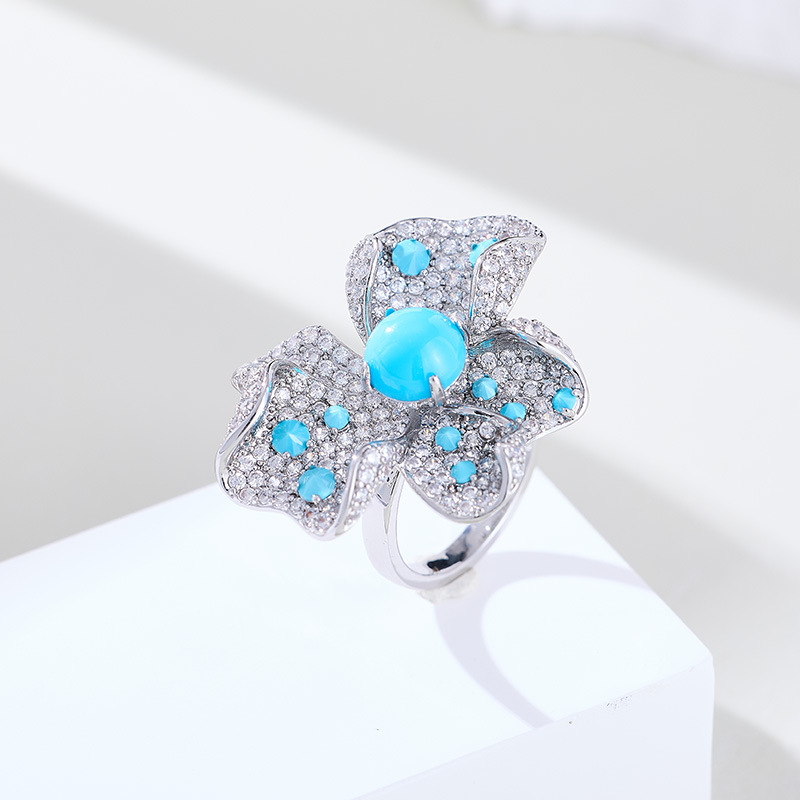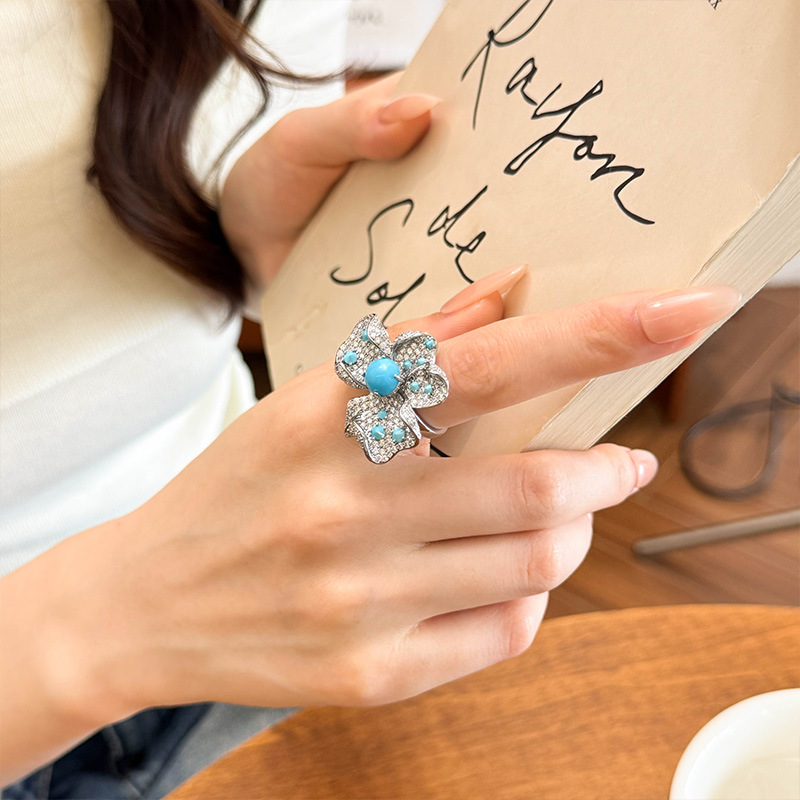 Light Luxury and High-End Heavy-Duty Inlaid Blue Turquoise Flower Earrings Women's Ring S925 Silver Needle Elegant Earrings Set Factory