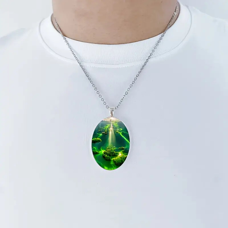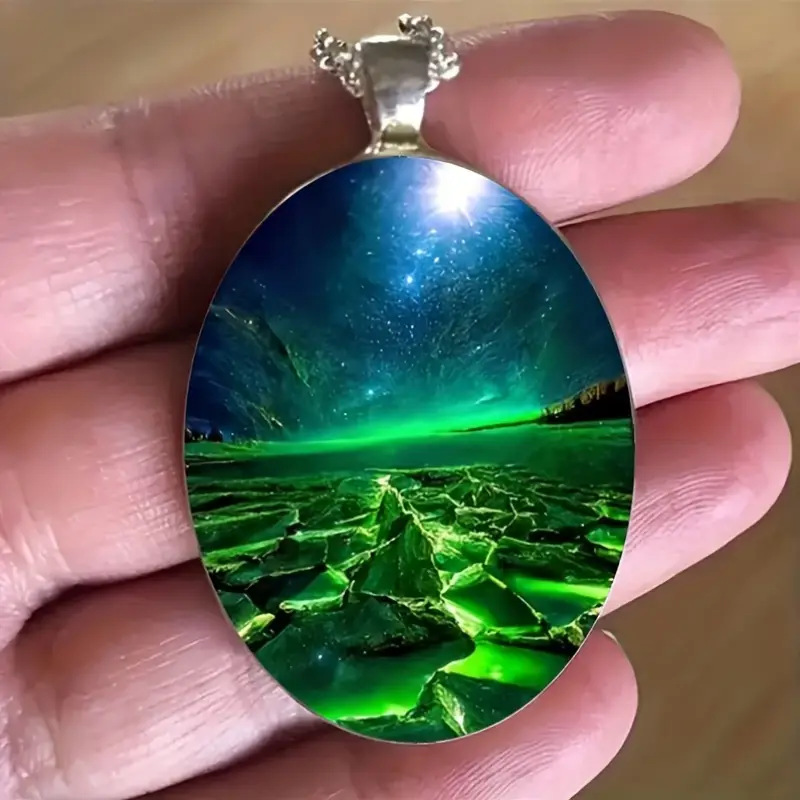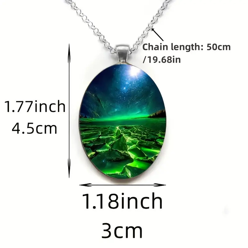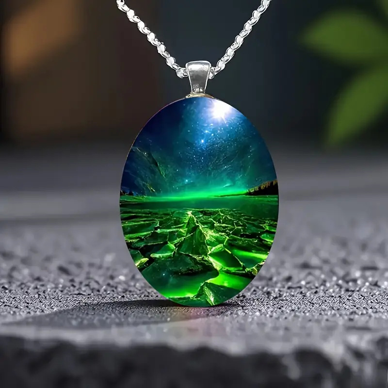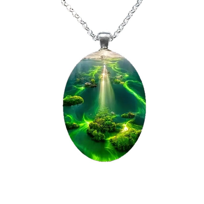 Elegant Green Aurora Natural Scenery Pattern Oval Glass Alloy Pendant and Stainless Steel Chain Necklace