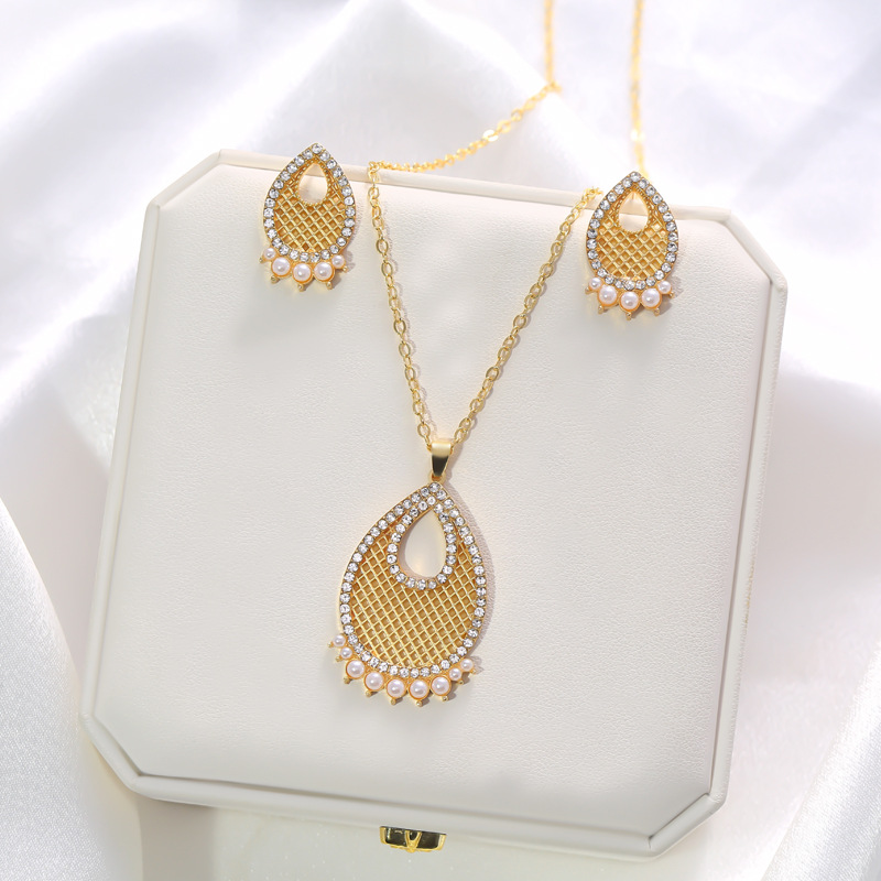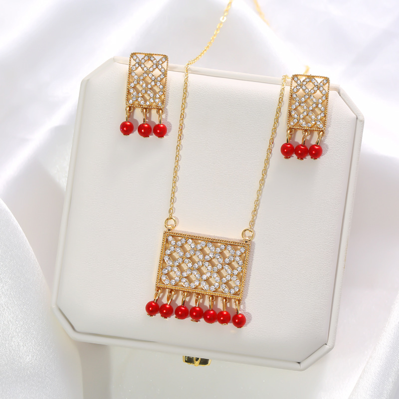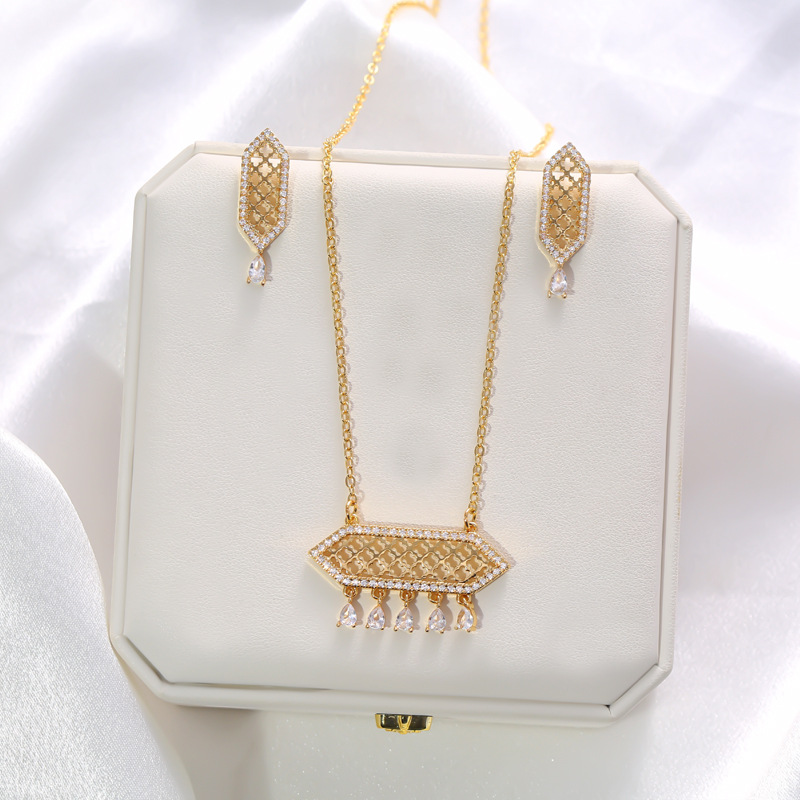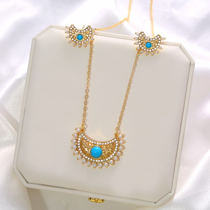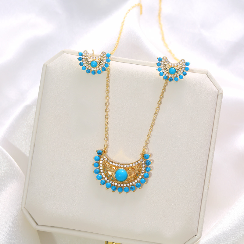 Cdd Earring and Necklace Set, Geometric Water Drop Design, Multi-Element Inlaid with Rhinestones or Turquoise, Vintage Style, Direct from the Source Factory