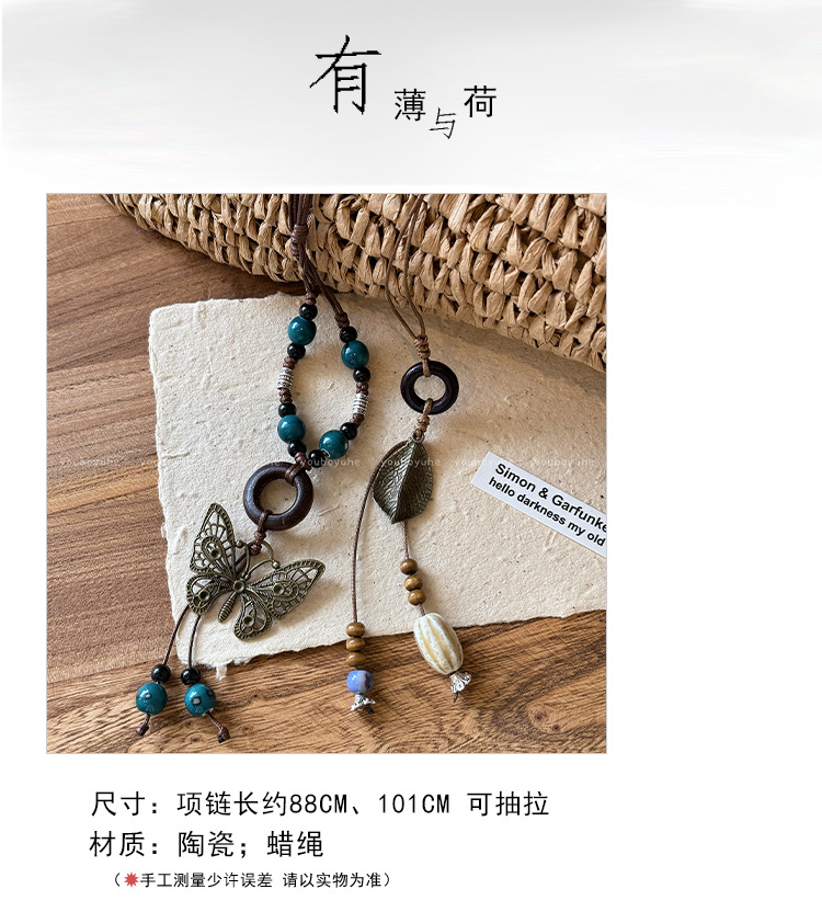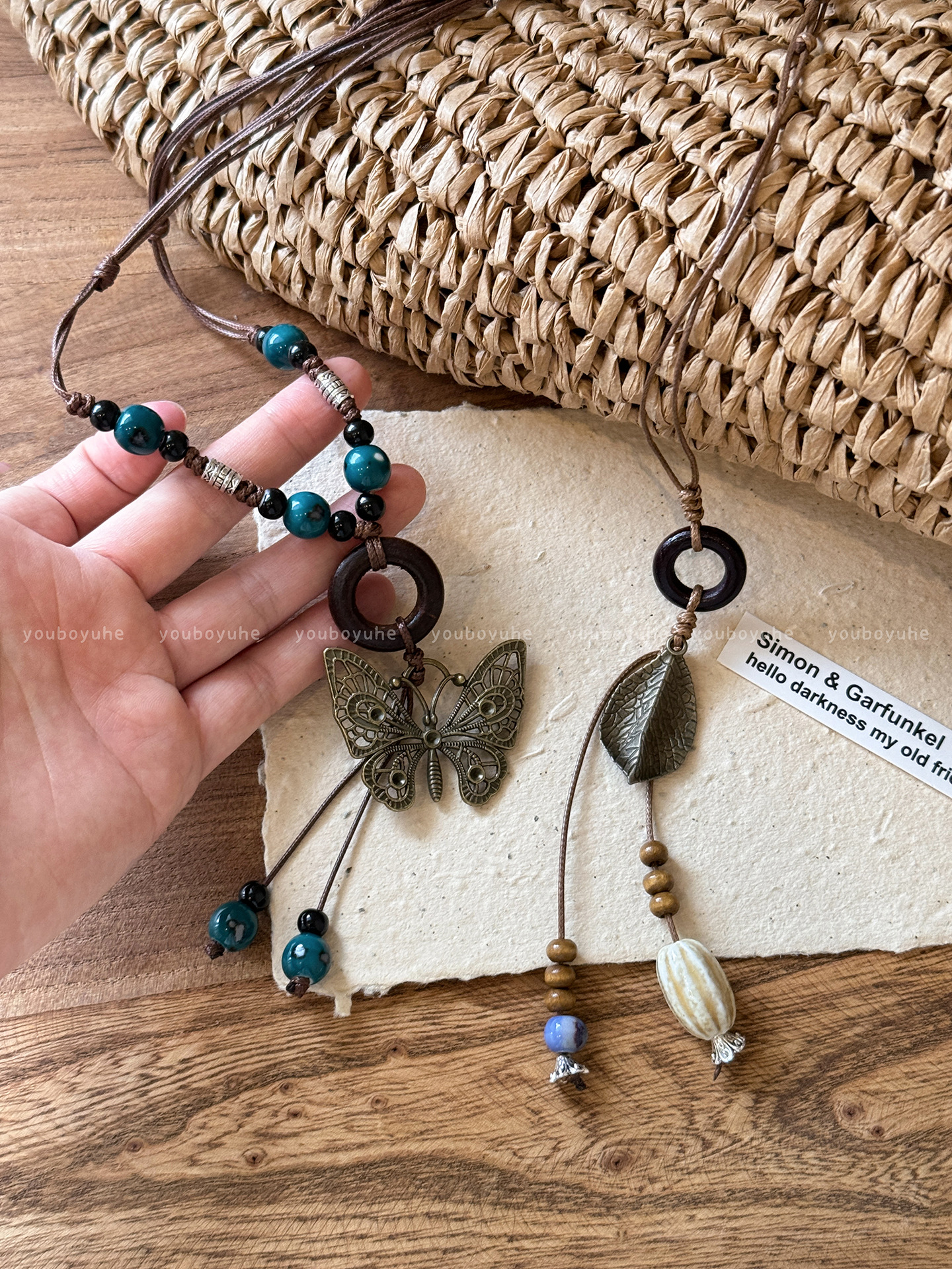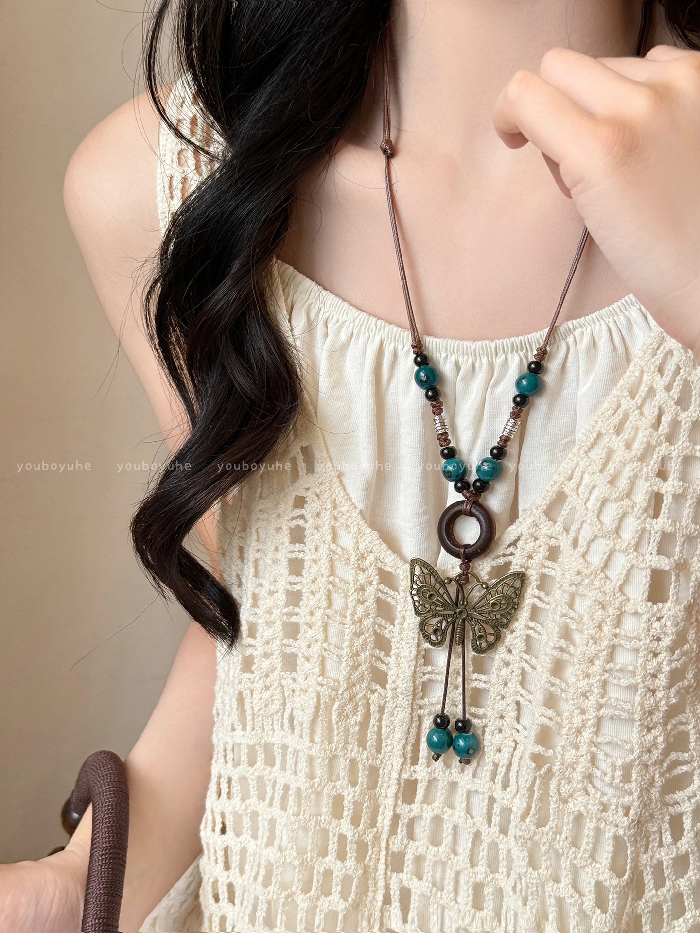 波西米亚风蝴蝶串珠编绳项链女新中式复古长款陶瓷挂链民族风配饰