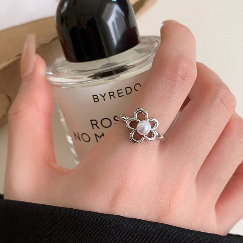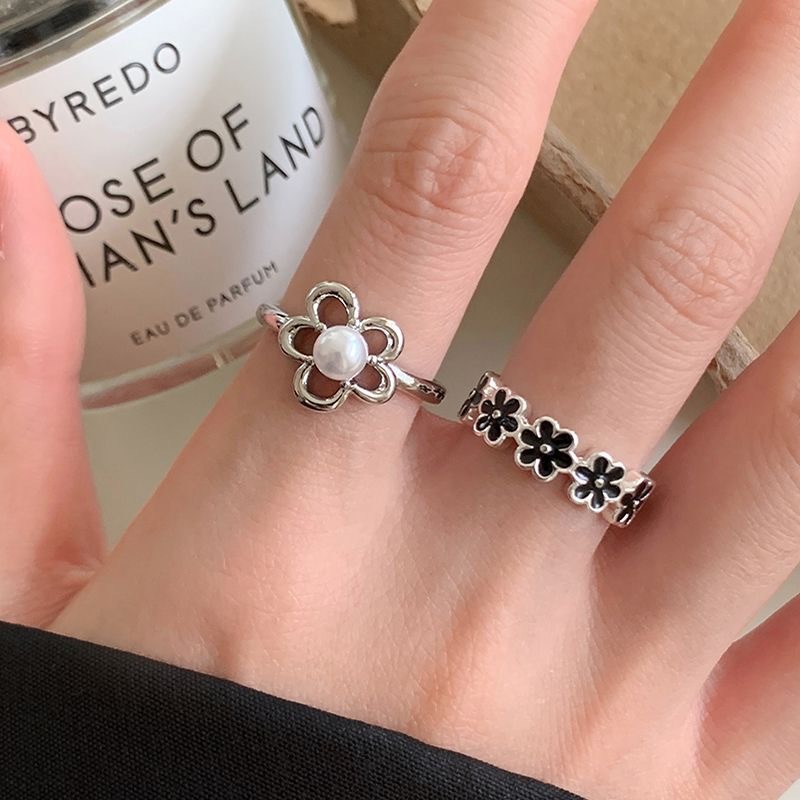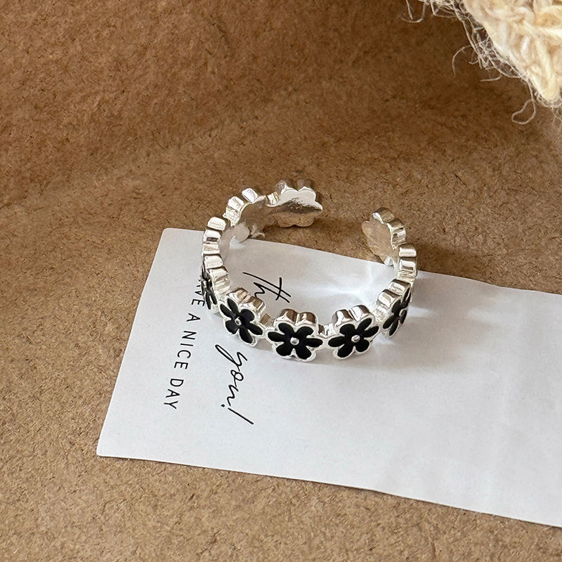 Black Drip Glaze Small Flower Open Ring for Women, Sweet Retro Elegant Index Finger Ring, High-End and Versatile Niche Ring