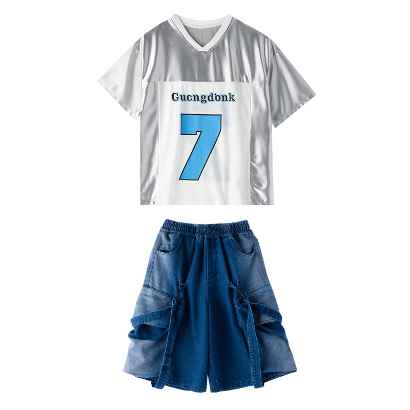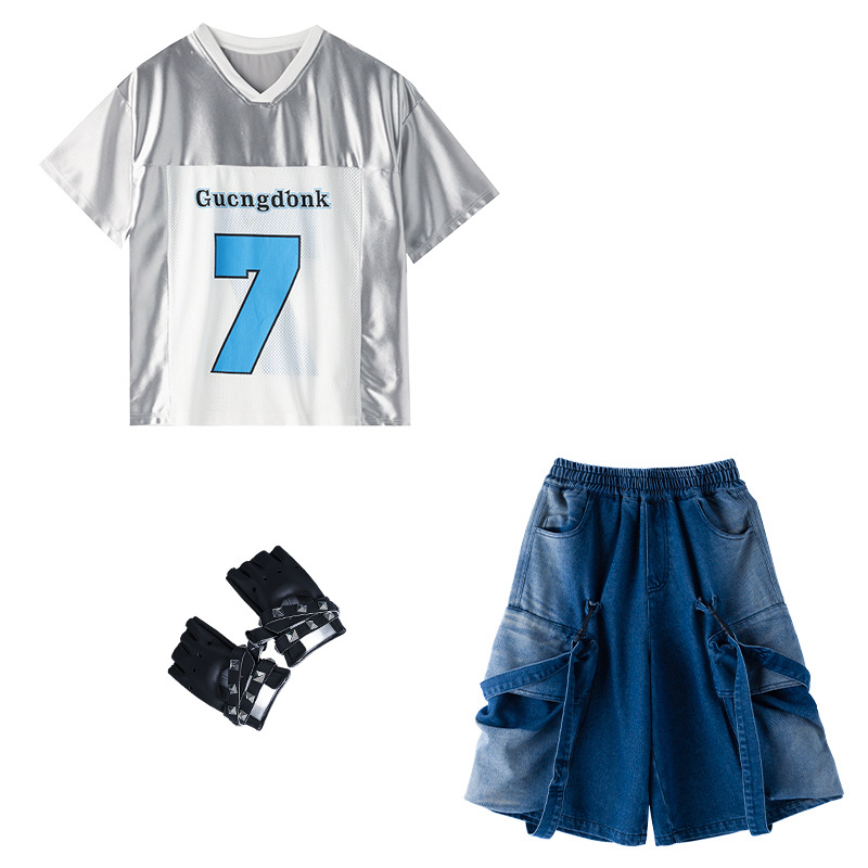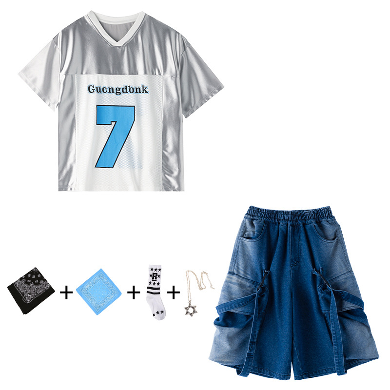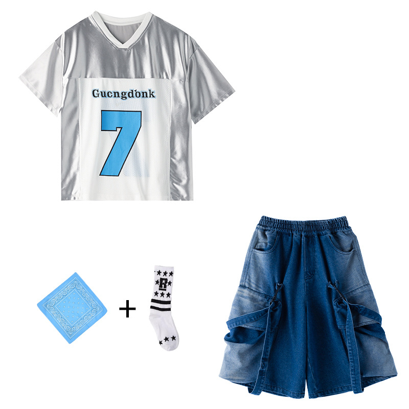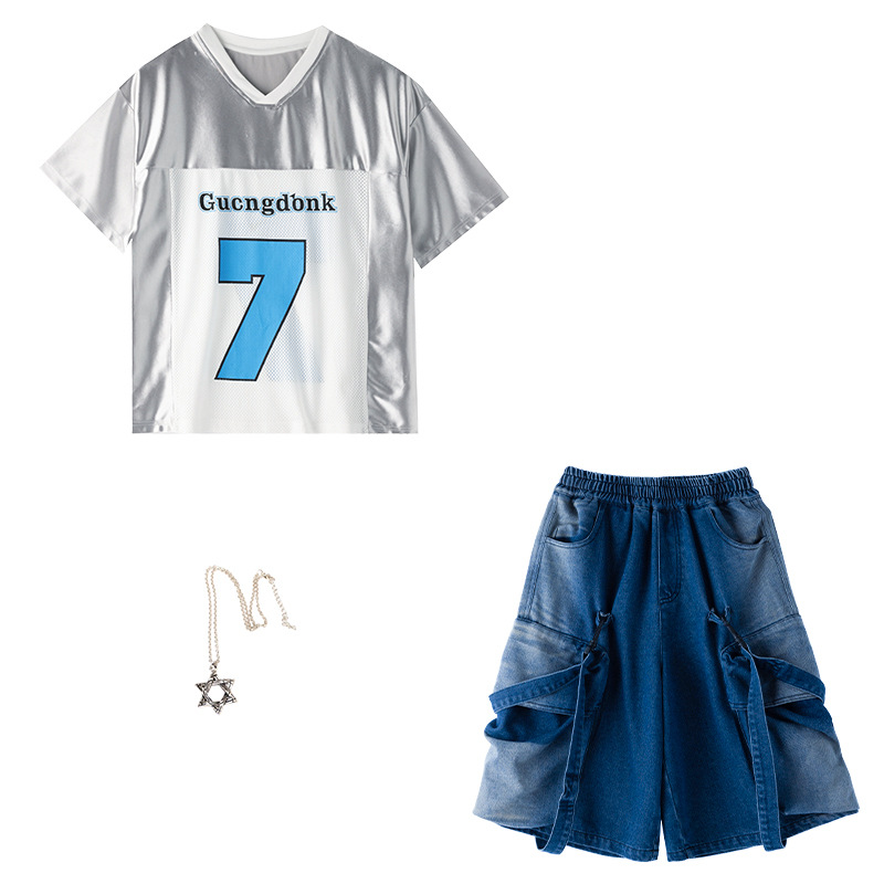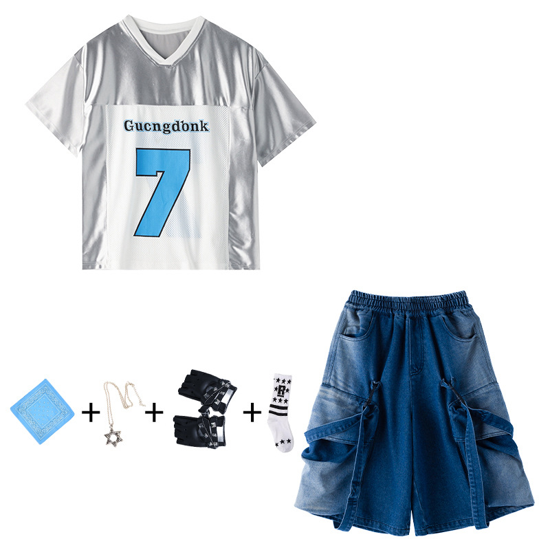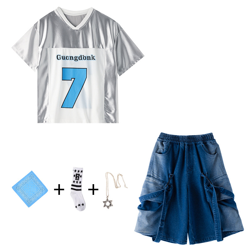 Color: A718 silver shiny leather short sleeves + b385 blue gradient denim shorts + white star socks