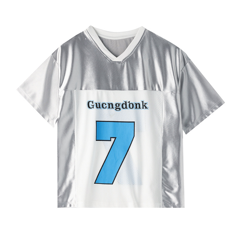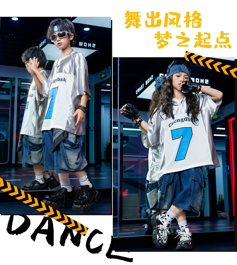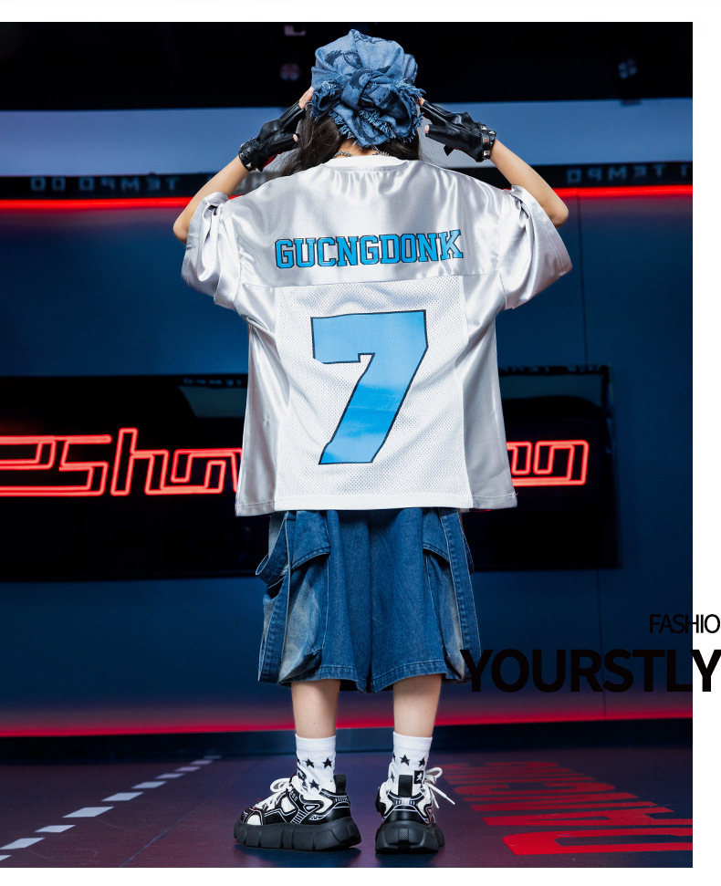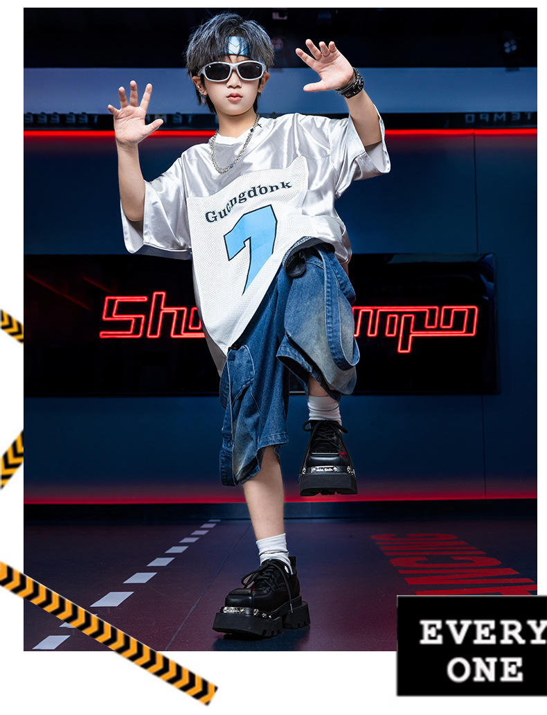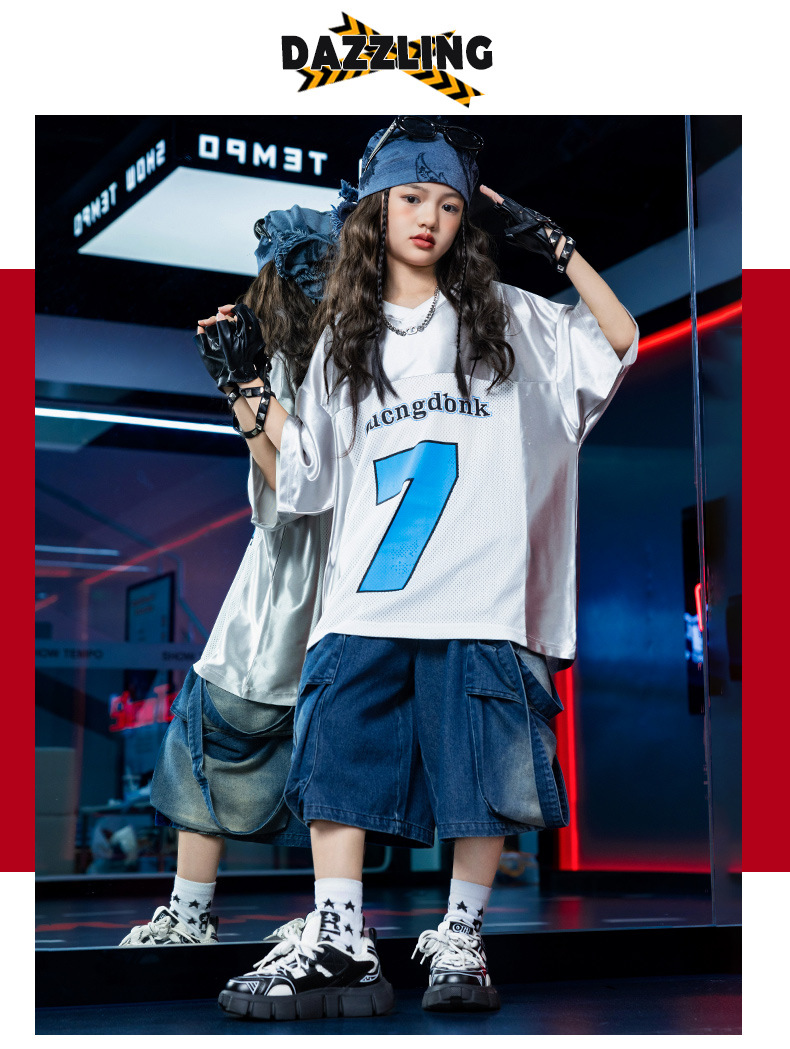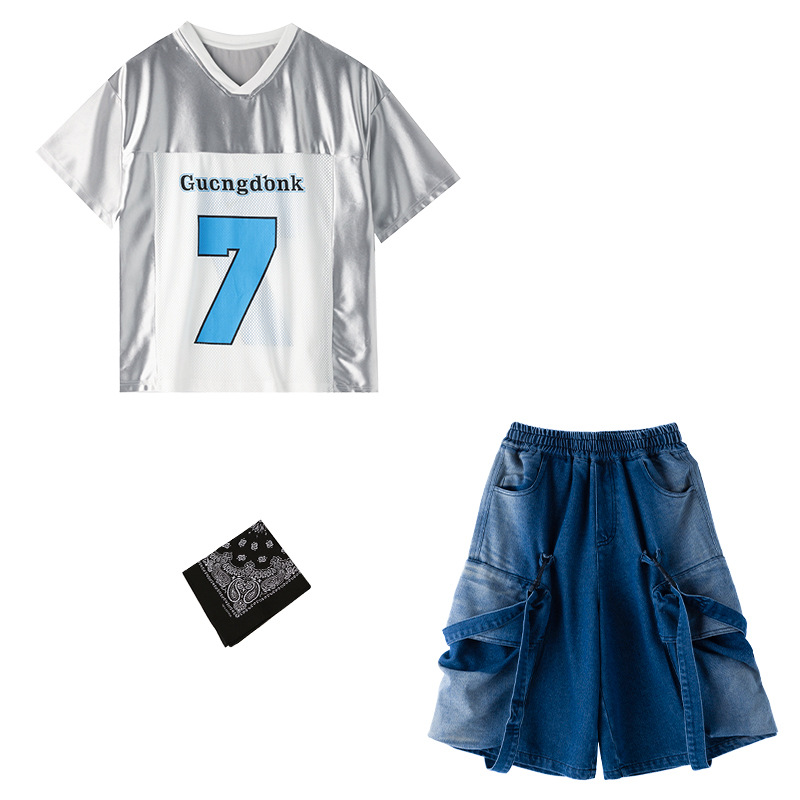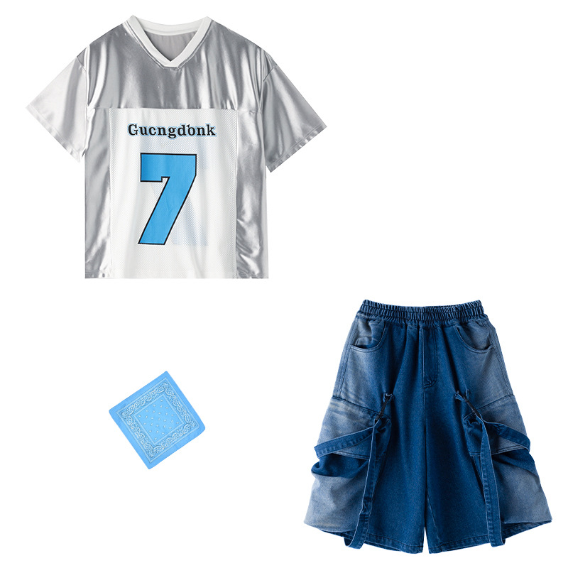 Color: A718 silver shiny leather short sleeves + b385 blue gradient denim shorts + white star socks