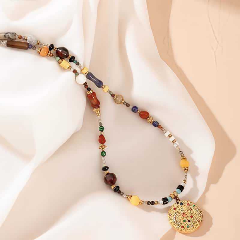 Gold Ethnic Style Pendant Necklace for Women, Medieval Chinese Style Millet Beads, Retro Beaded Bohemian Colorful Accessories