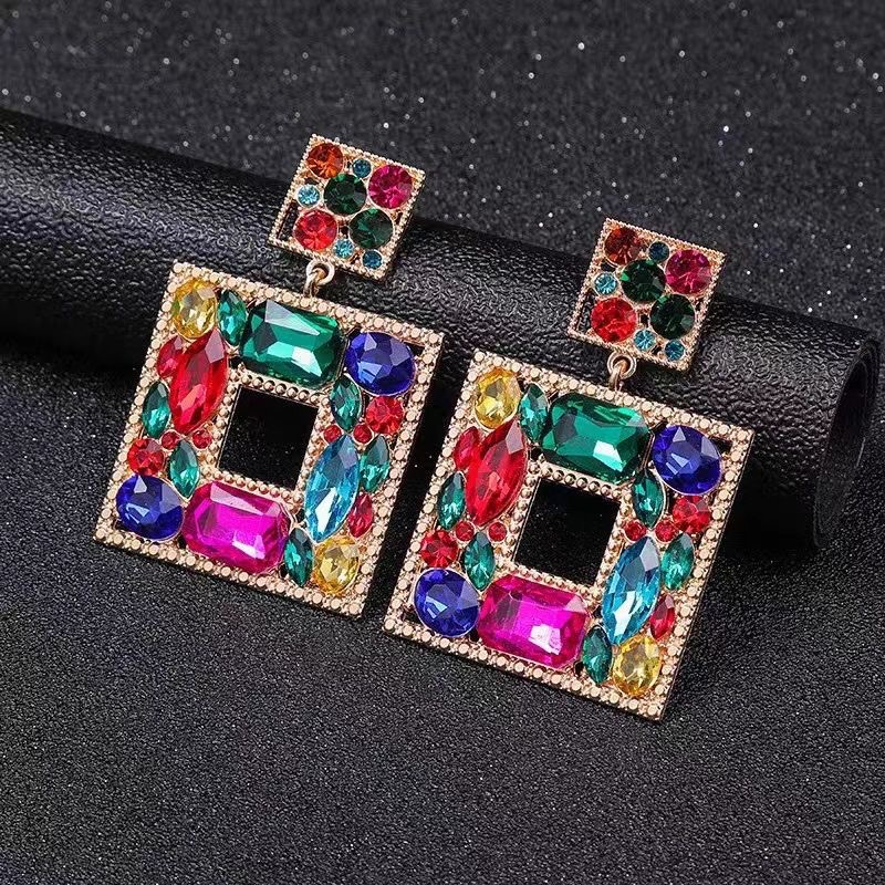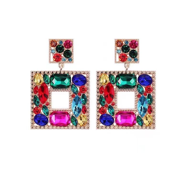 European and American Exaggerated Geometric Square Colored Diamond Earrings with Unique Style, Hollow Alloy Ear Dangle Earrings for Women, Niche