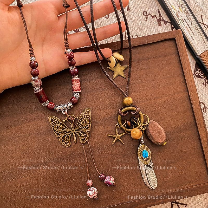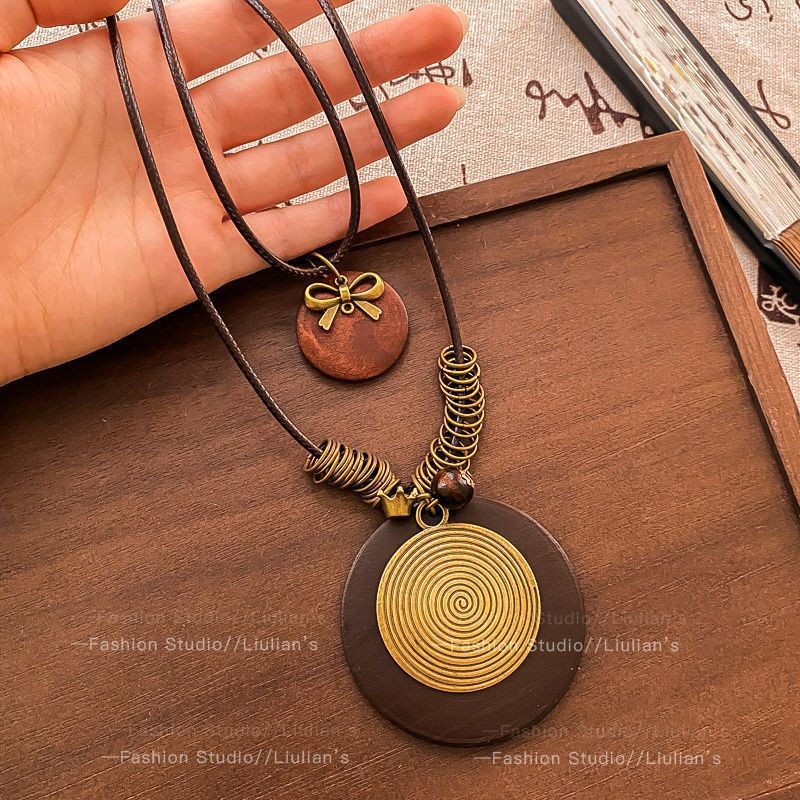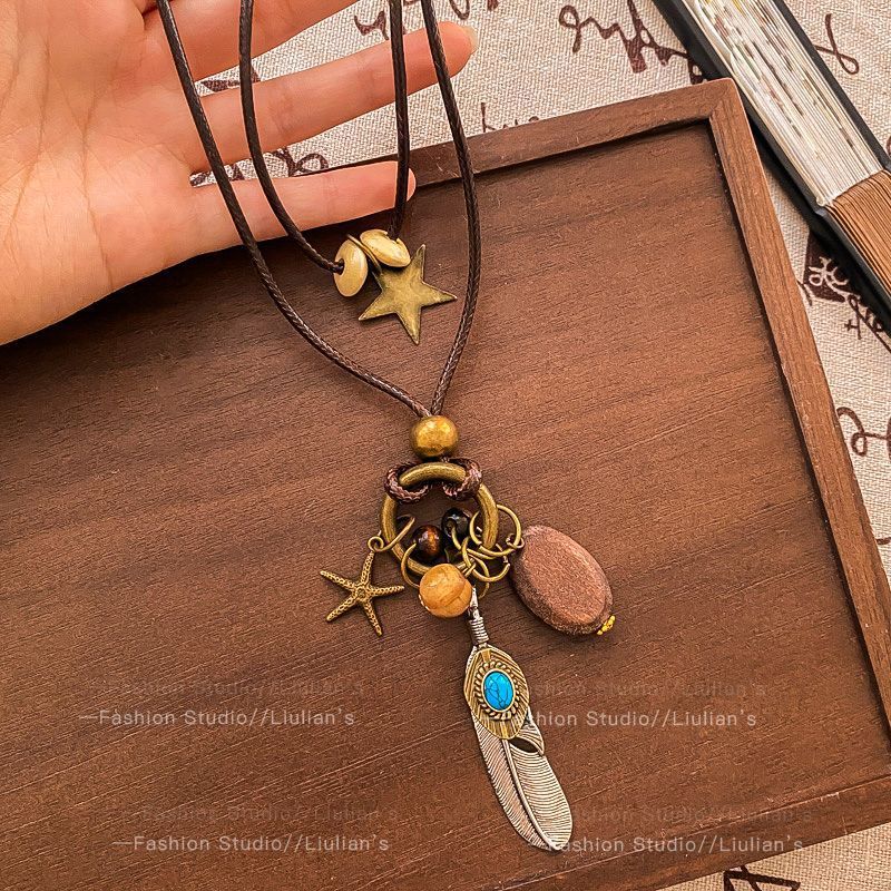 Ethnic Style Zen Bronze Long Necklace for Women Bohemian Stacked Necklace New Chinese Style Retro Versatile Accessories