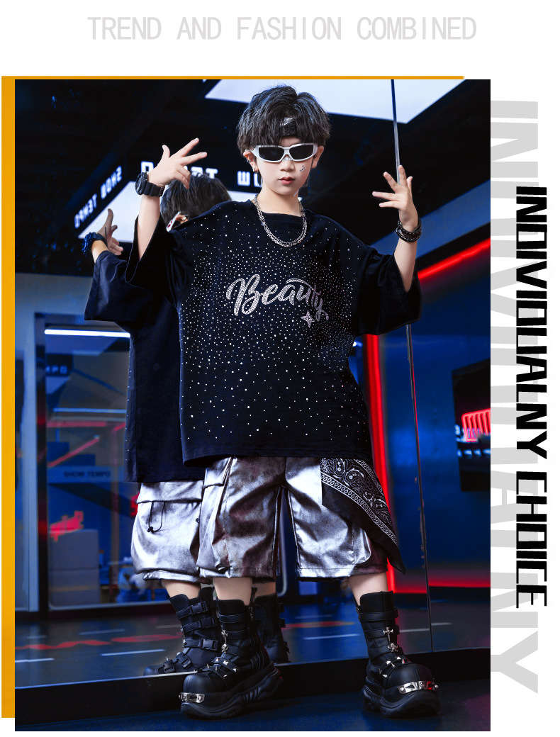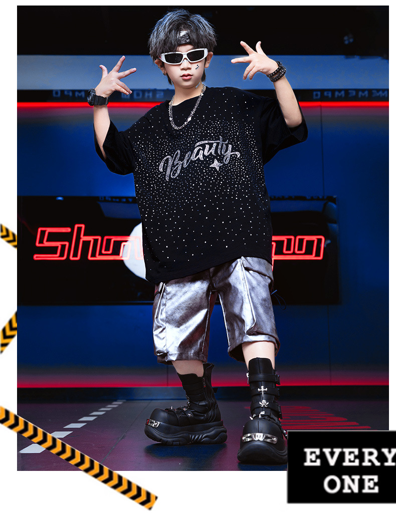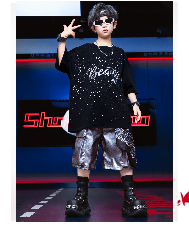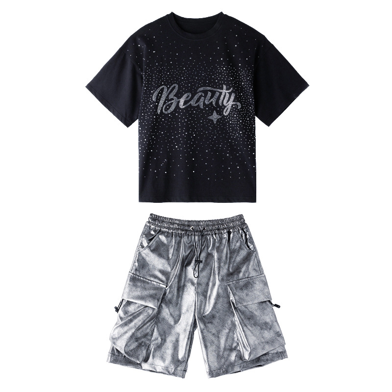 Color: A722 black shiny diamond top + b386 silver shiny leather tie-dye cargo shorts