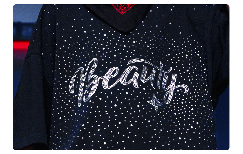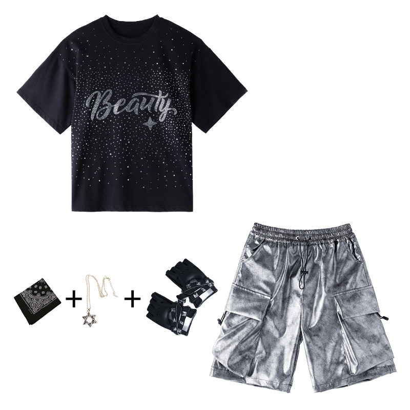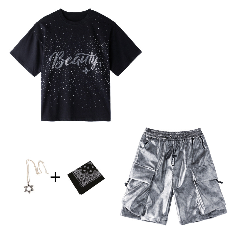 Color: A722 black shiny diamond top + b386 silver shiny leather tie-dye cargo shorts + necklace
