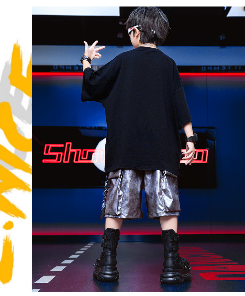 Color: A722 black shiny diamond top + b386 silver shiny leather tie-dye cargo shorts + black willow leather gloves