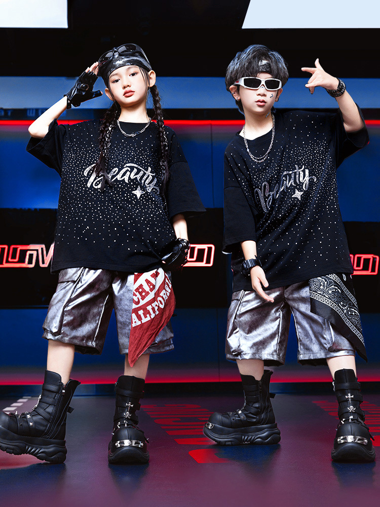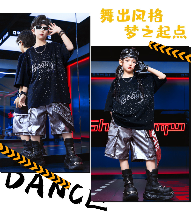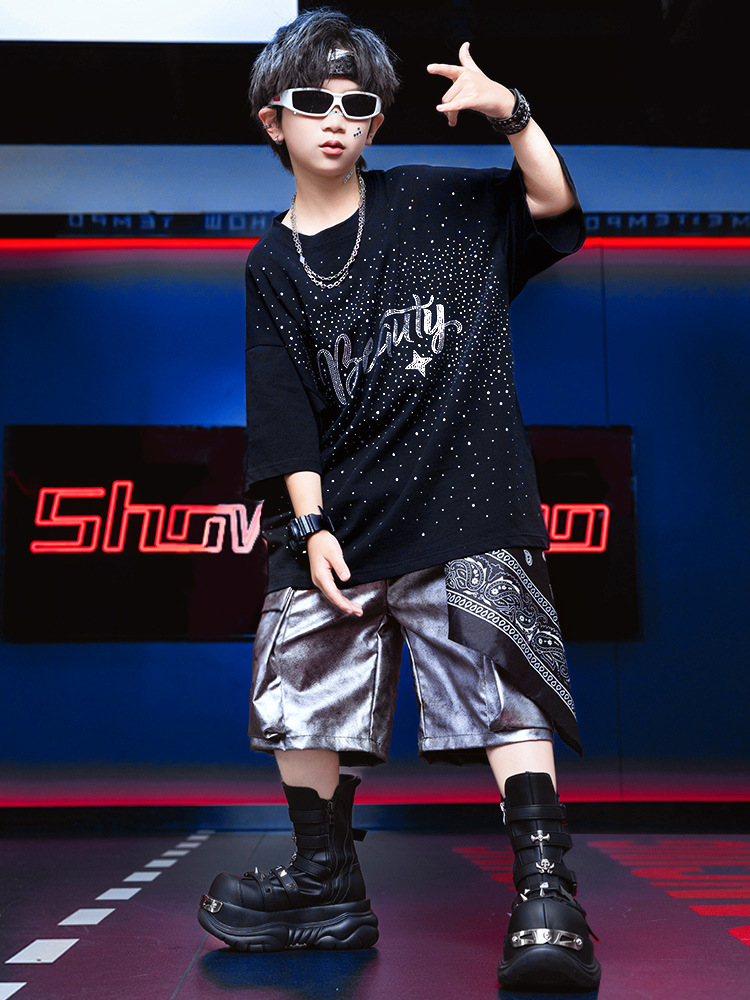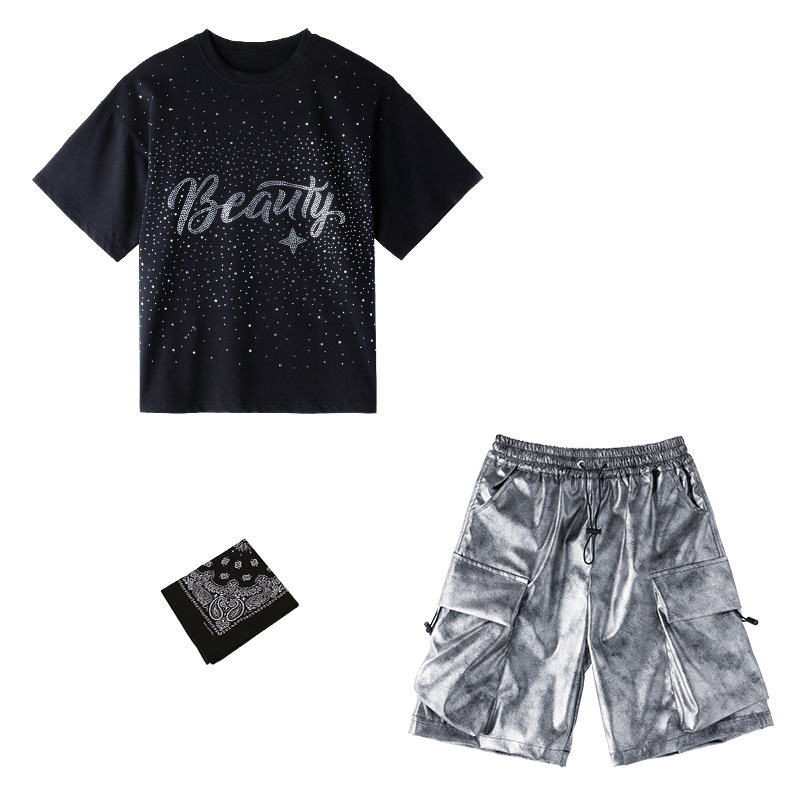 Color: A722 black shiny diamond top + b386 silver shiny leather tie-dye cargo shorts + black square scarf
