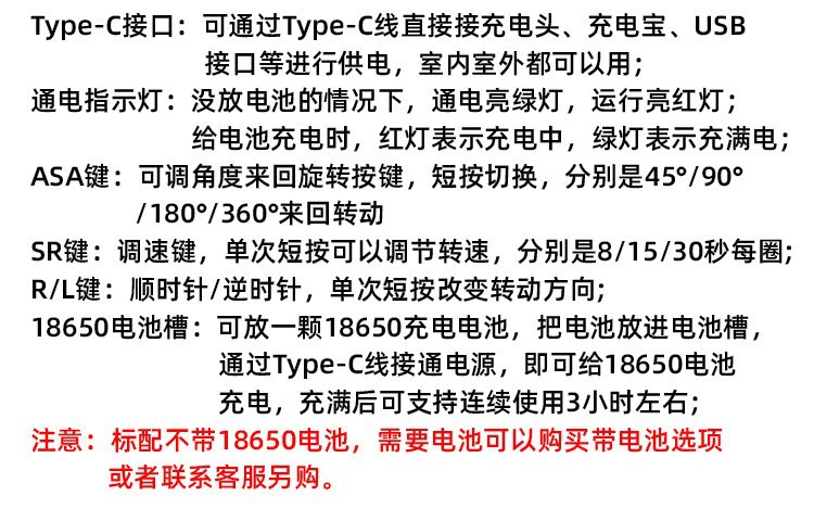 3.SR:速度切换,8秒、15秒、30秒/圈,短按操作。