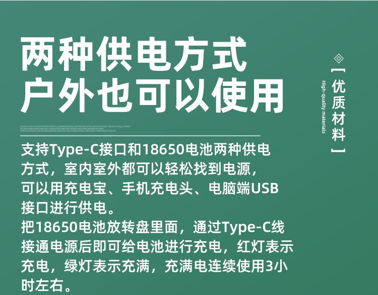 5、三种供电模式可供选择,分别为USB直插交流电供电、USB接充电宝供电、18650充电锂电池供电。