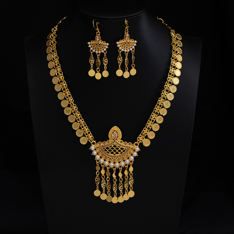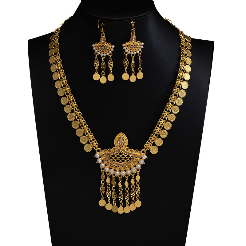 跨境新款首饰套装中东迪拜热销金色合金镂空水晶钱币流苏项链耳环饰品批发货源