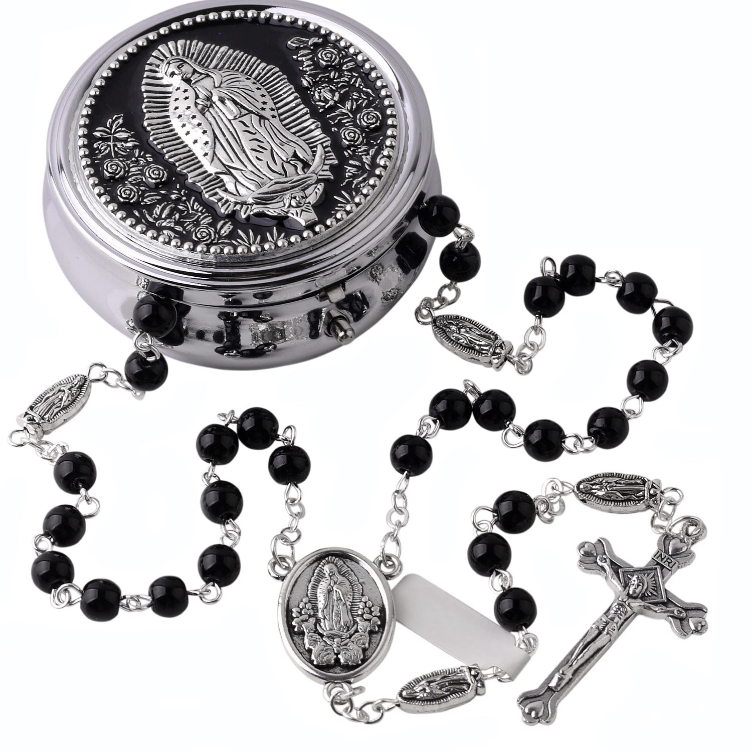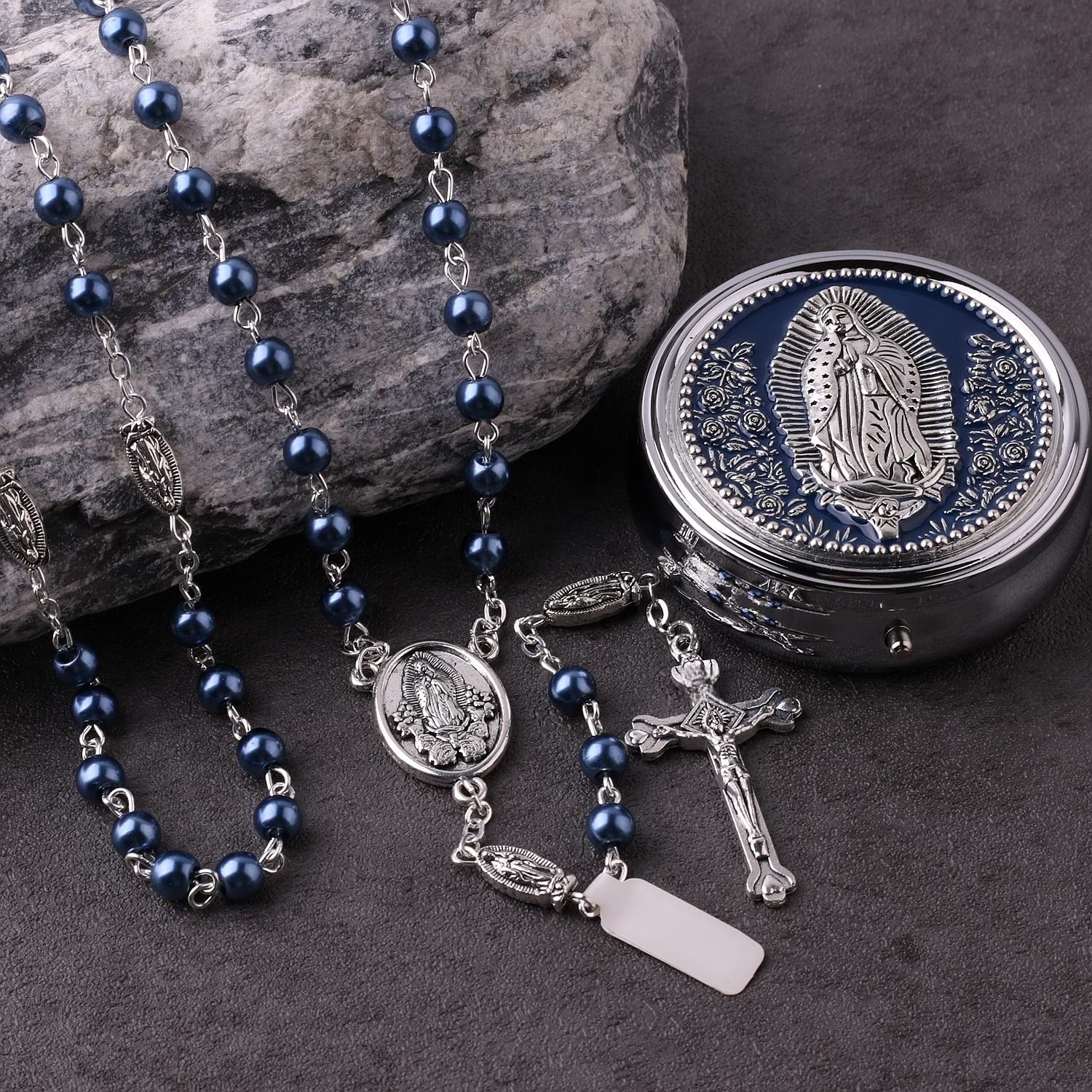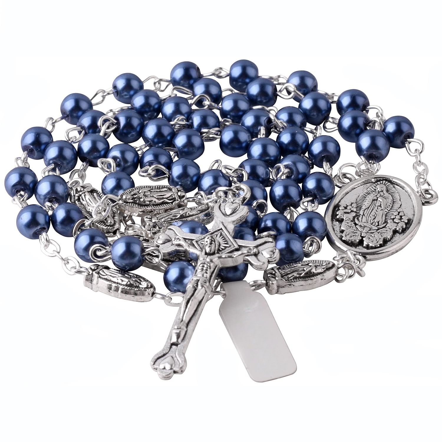 玻璃珍珠念珠项链长度为 53 厘米左右(20.8 英寸),念珠单位重量为 36 克,带有圣母图案金属礼盒的念珠单位重量为 94克,中心件和十字架是合金镀仿银。