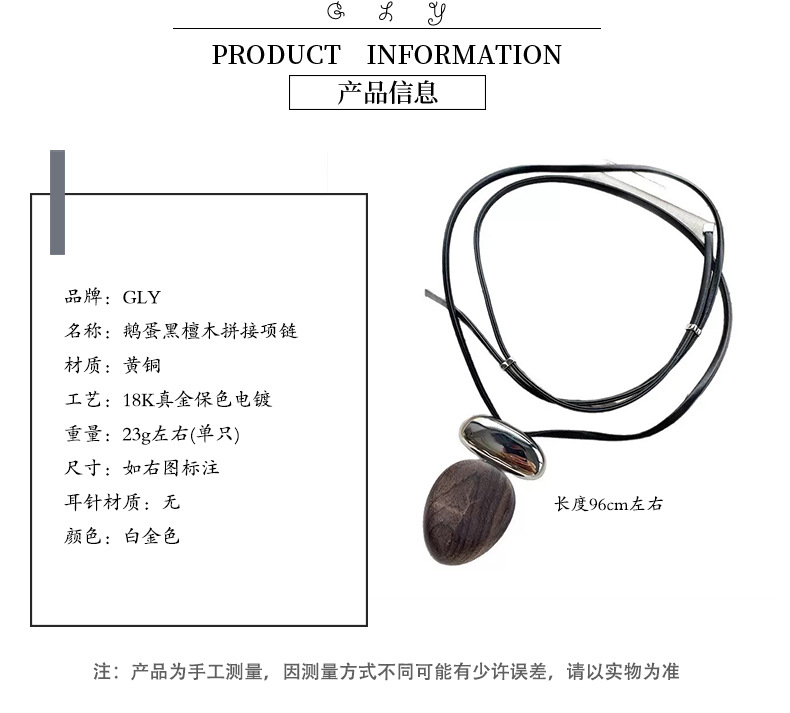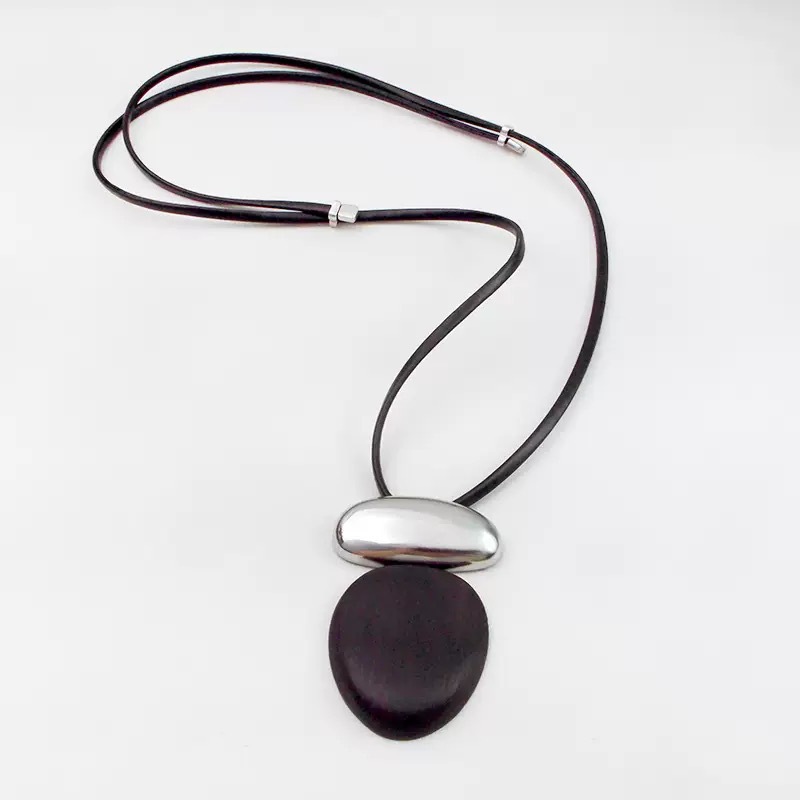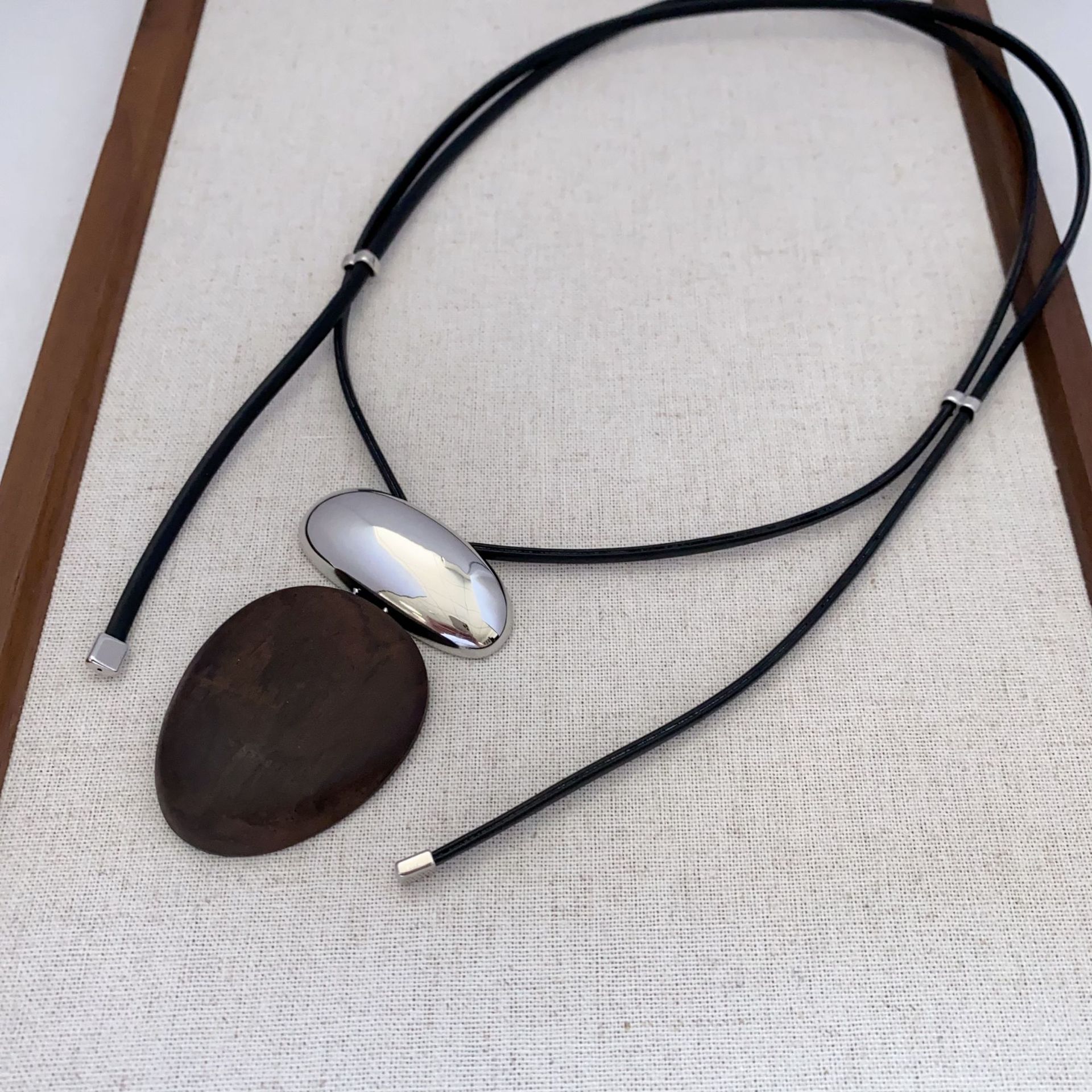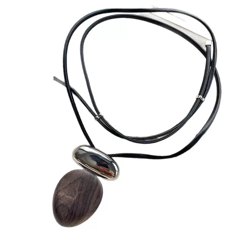 French-Style Retro Oval Ebony Metal Splicing Necklace with Leather Cord, High-End Niche Versatile Long Sweater Chain