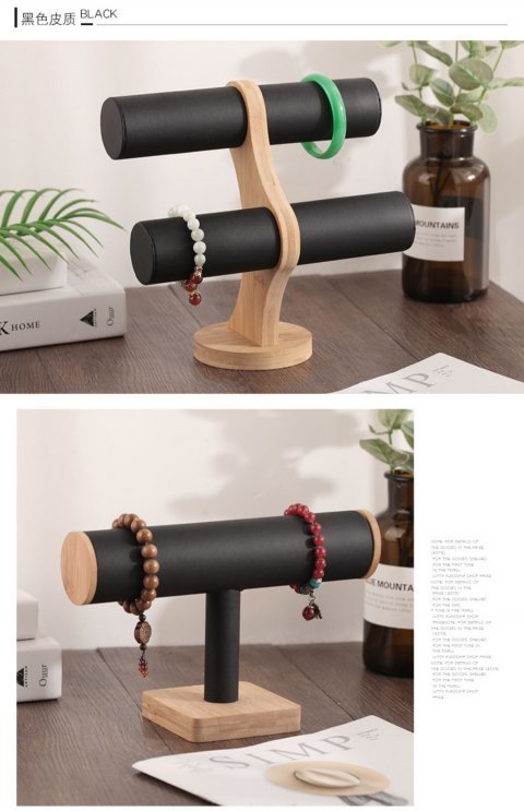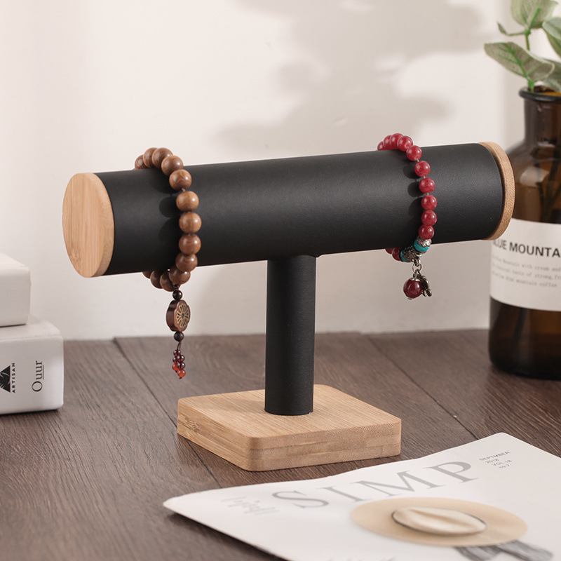 Color: Bamboo wood cylinder single layer bracelet stand black leather