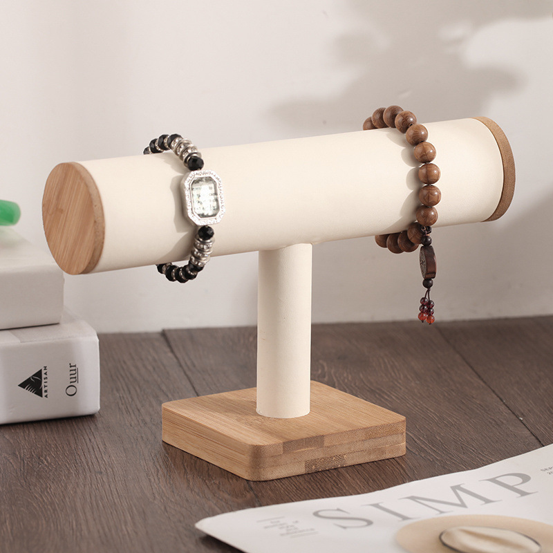 Color: Bamboo wood cylinder single layer bracelet stand white leather