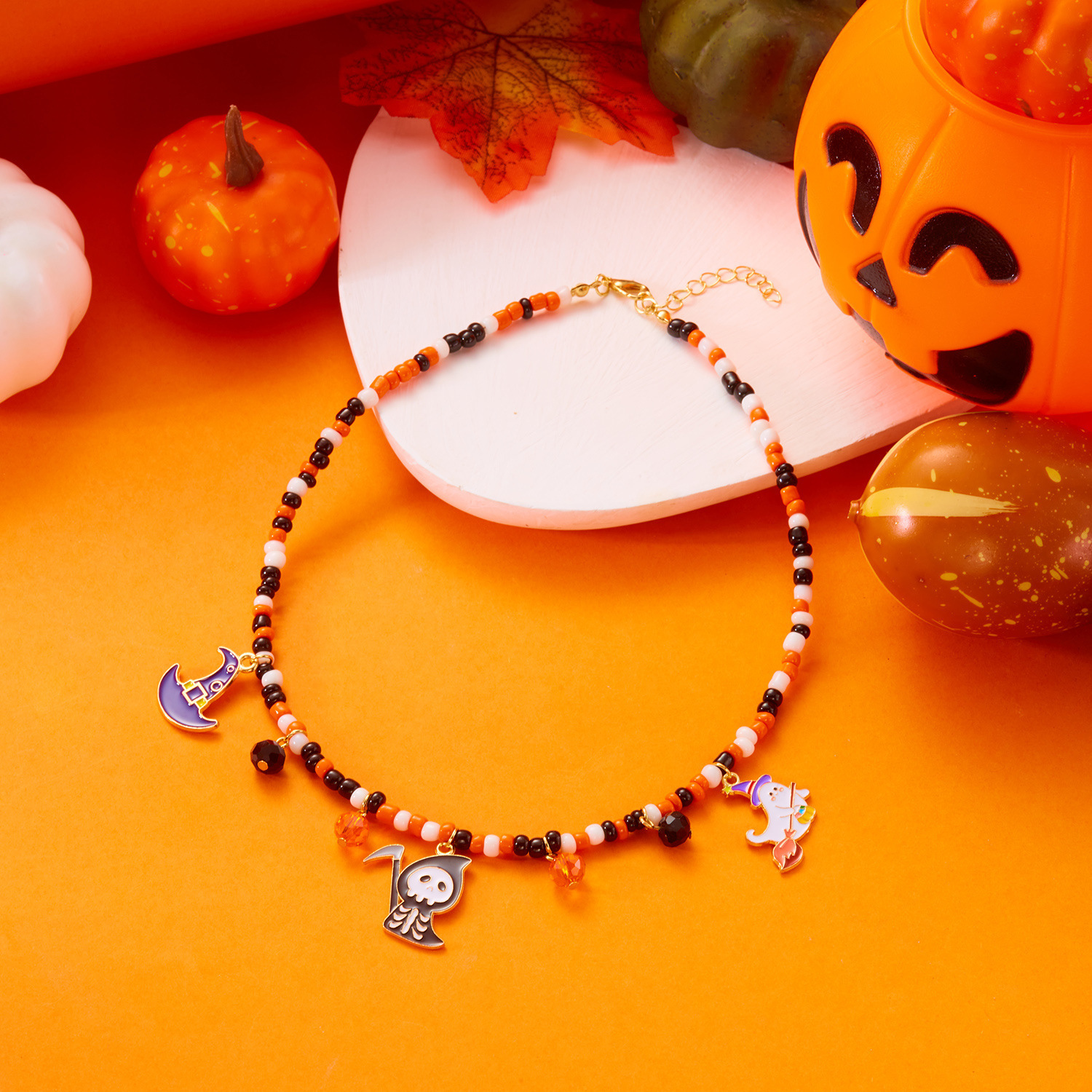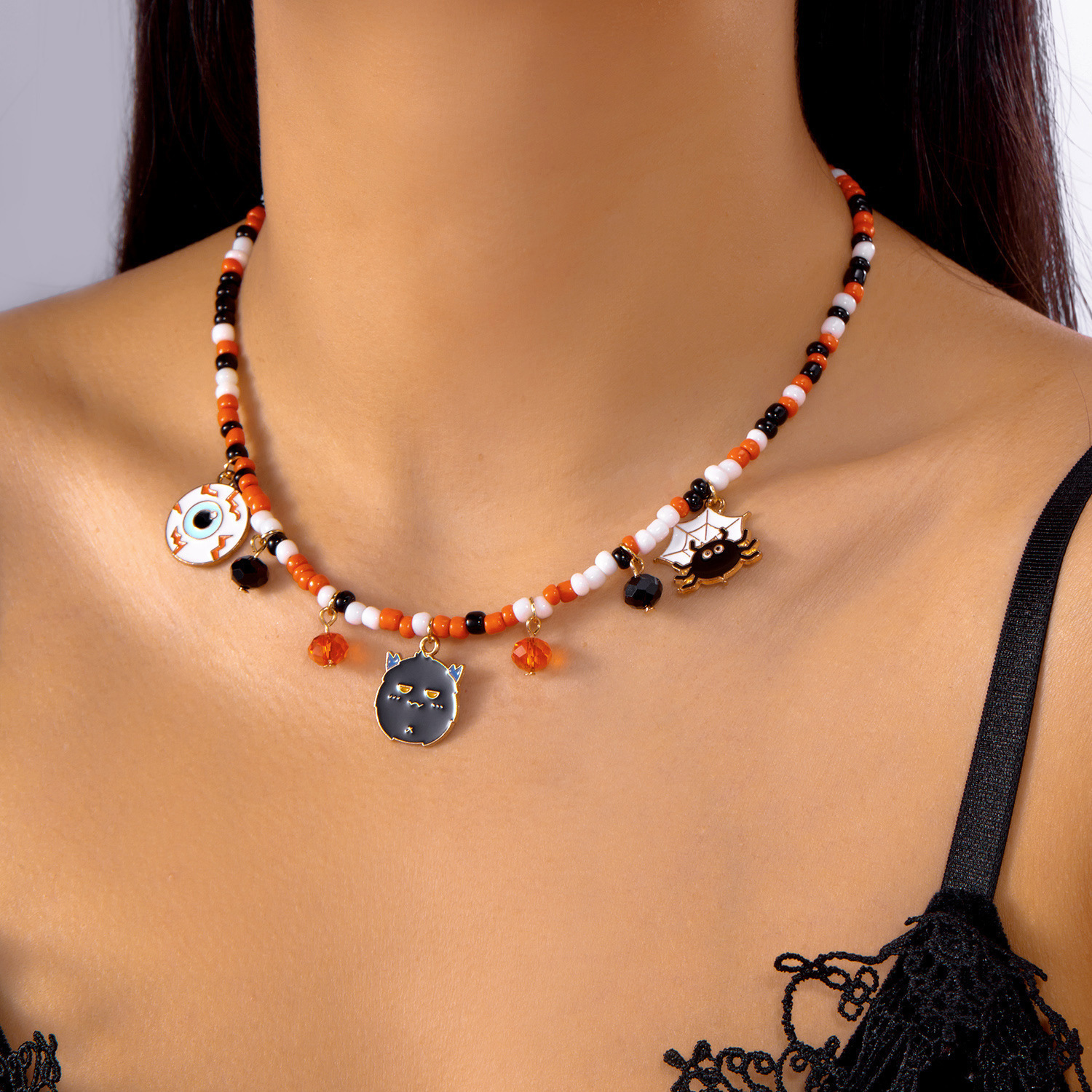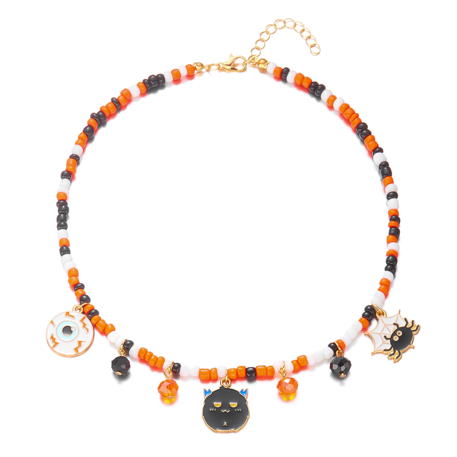 Halloween Jewelry Fashionable and Versatile Pumpkin Color Horror Style Ghost Spider Pendant Handmade Rice Beads Beaded Necklace