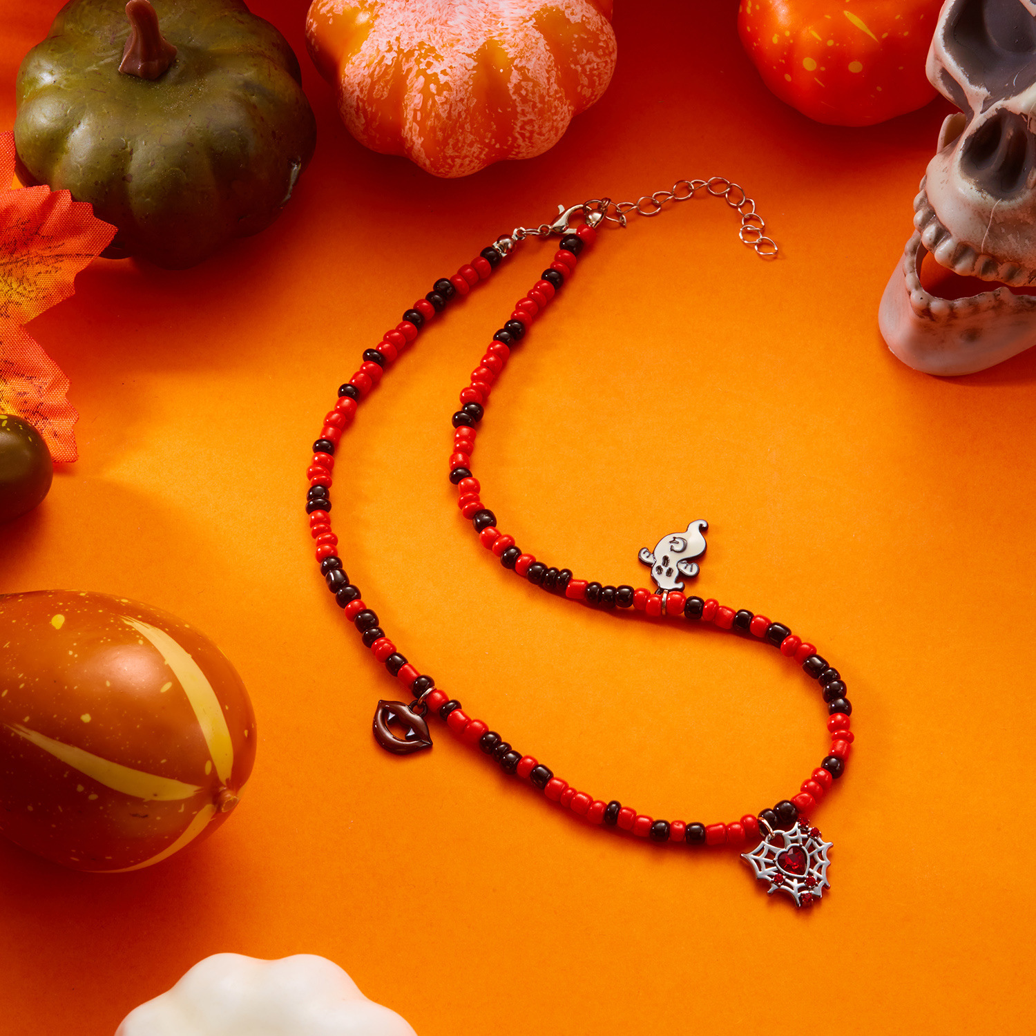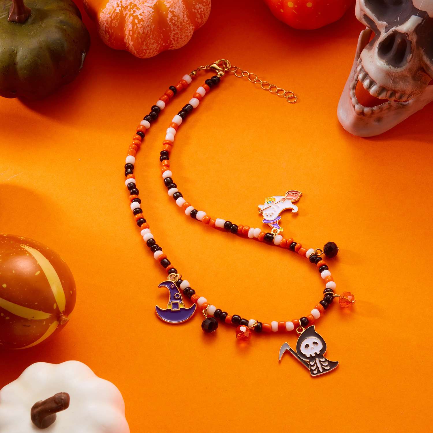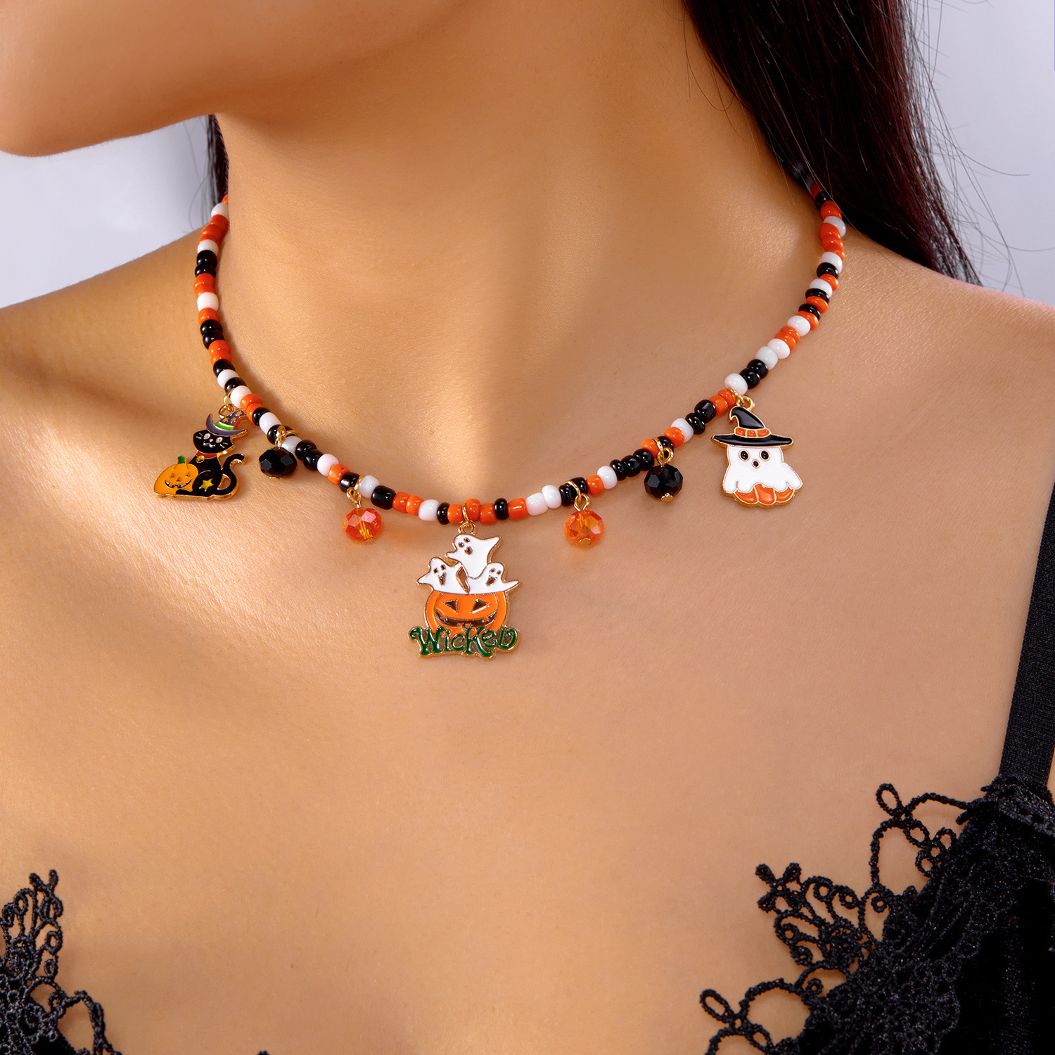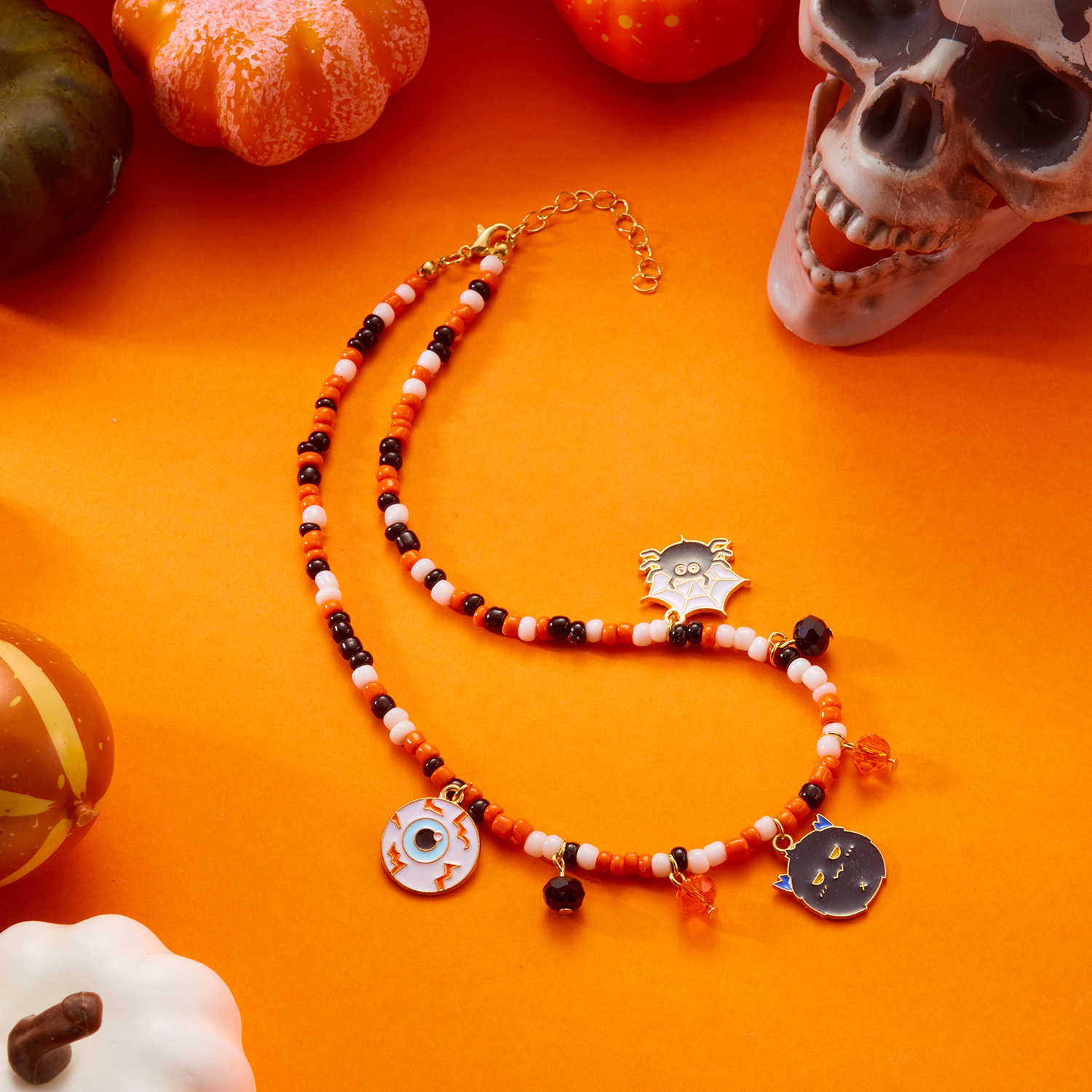 Halloween Jewelry Fashionable and Versatile Pumpkin Color Horror Style Ghost Spider Pendant Handmade Rice Beads Beaded Necklace
