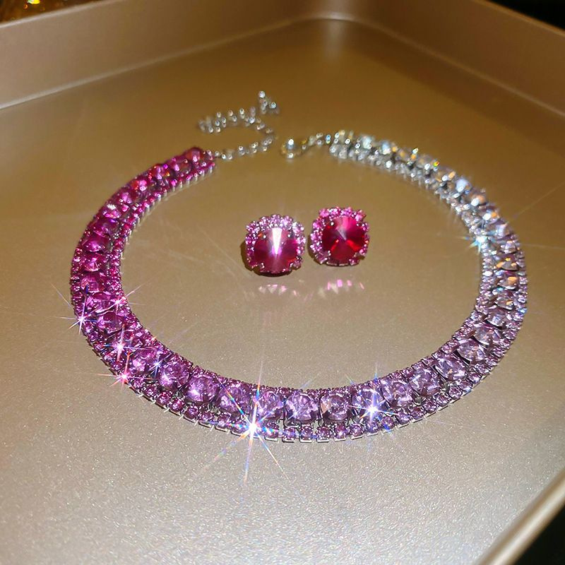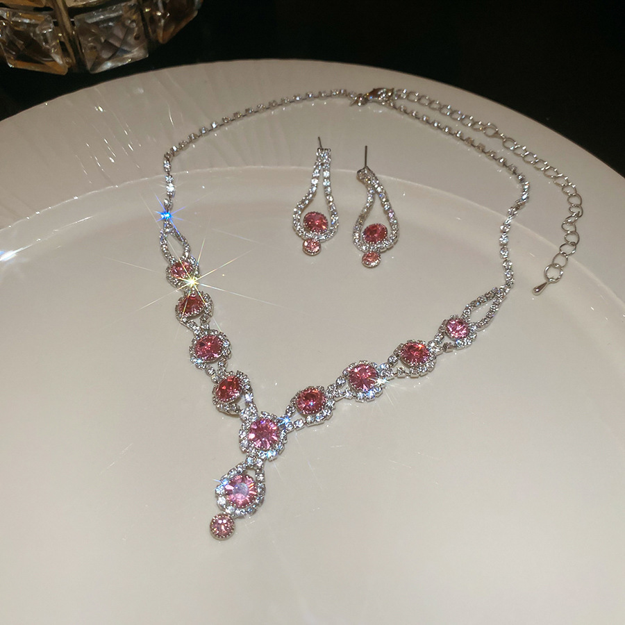 Color: 75#Earrings and necklace-silver-pink (set of two)