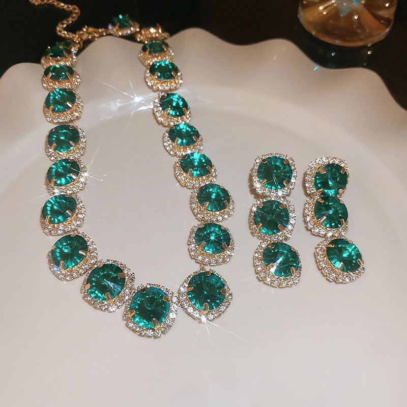Color: 22#Earrings and necklace-gold-green (set of two)
