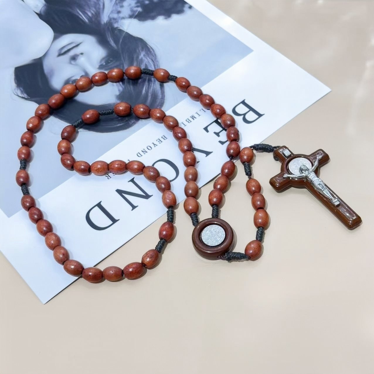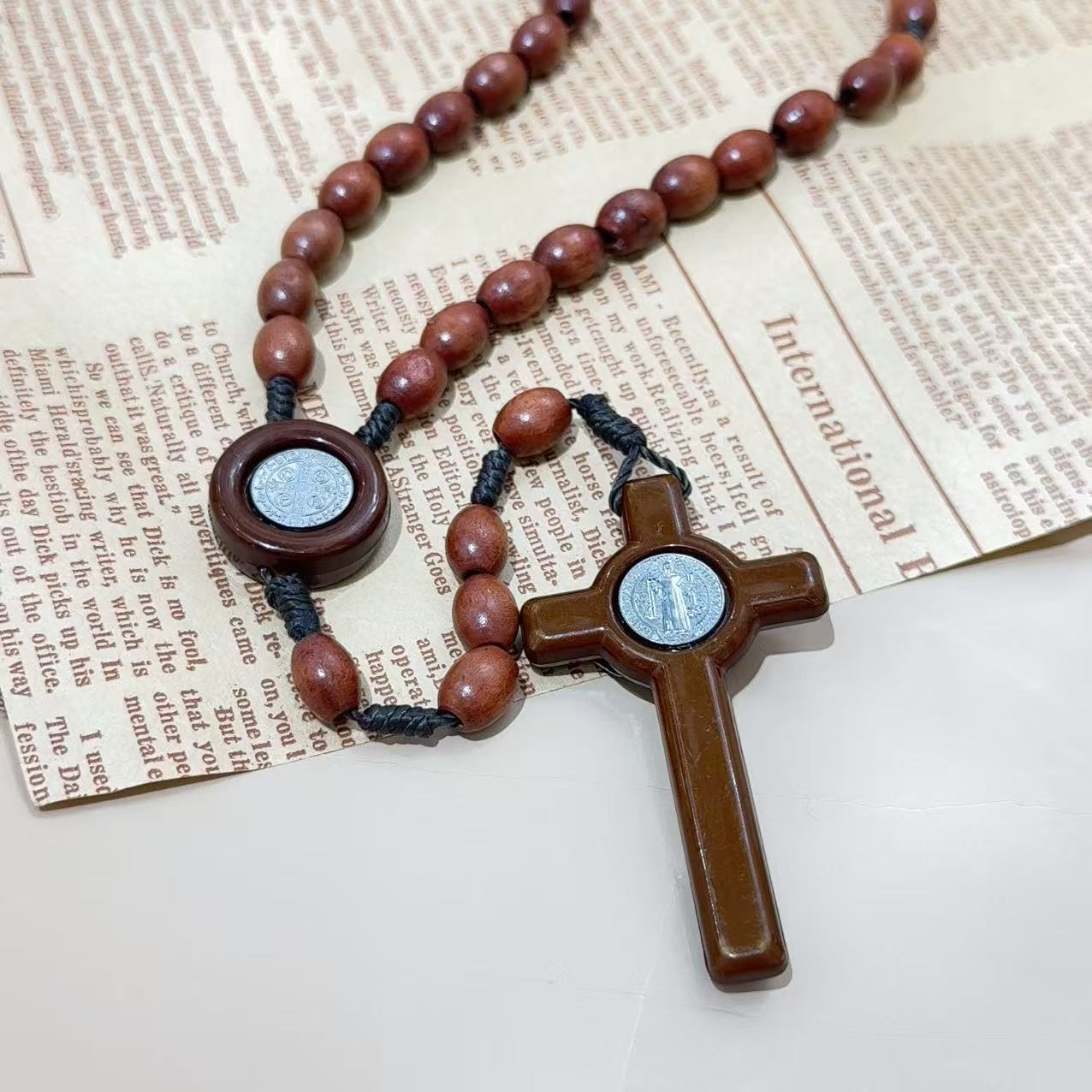 Cross-Border New Product Easter Jesus Cross Necklace Long Wooden Rosary Hand-Woven Jewelry Accessories