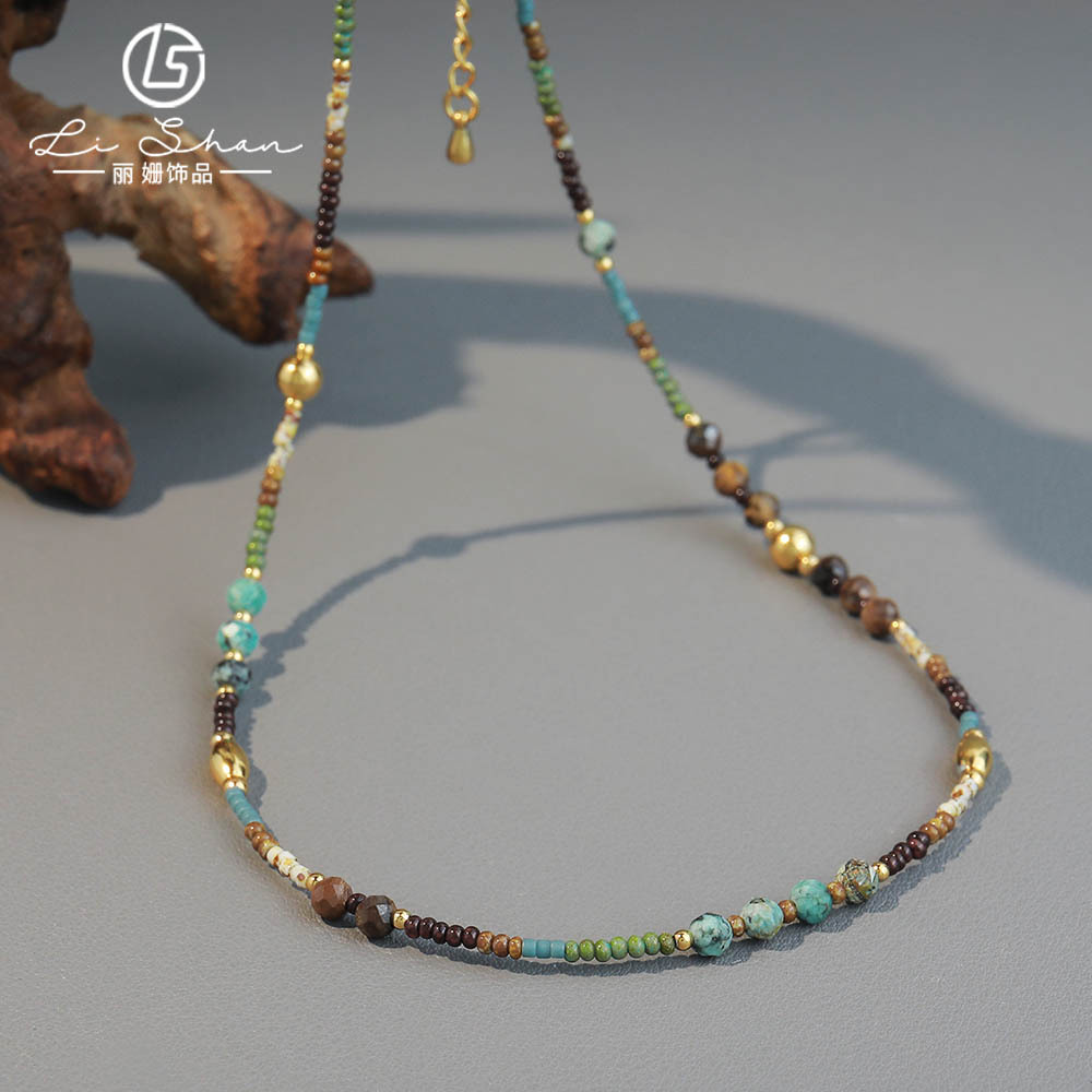 French retro niche design colorful natural stone rice beads beaded necklace bohemian style fashion clavicle chain