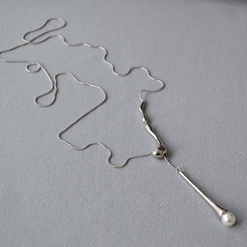 Autumn and Winter New Style Pull-Out Water Drop Pearl Necklace Metal Texture Long Necklace Women's Accessible Luxury Retro Elegant Sweater Chain