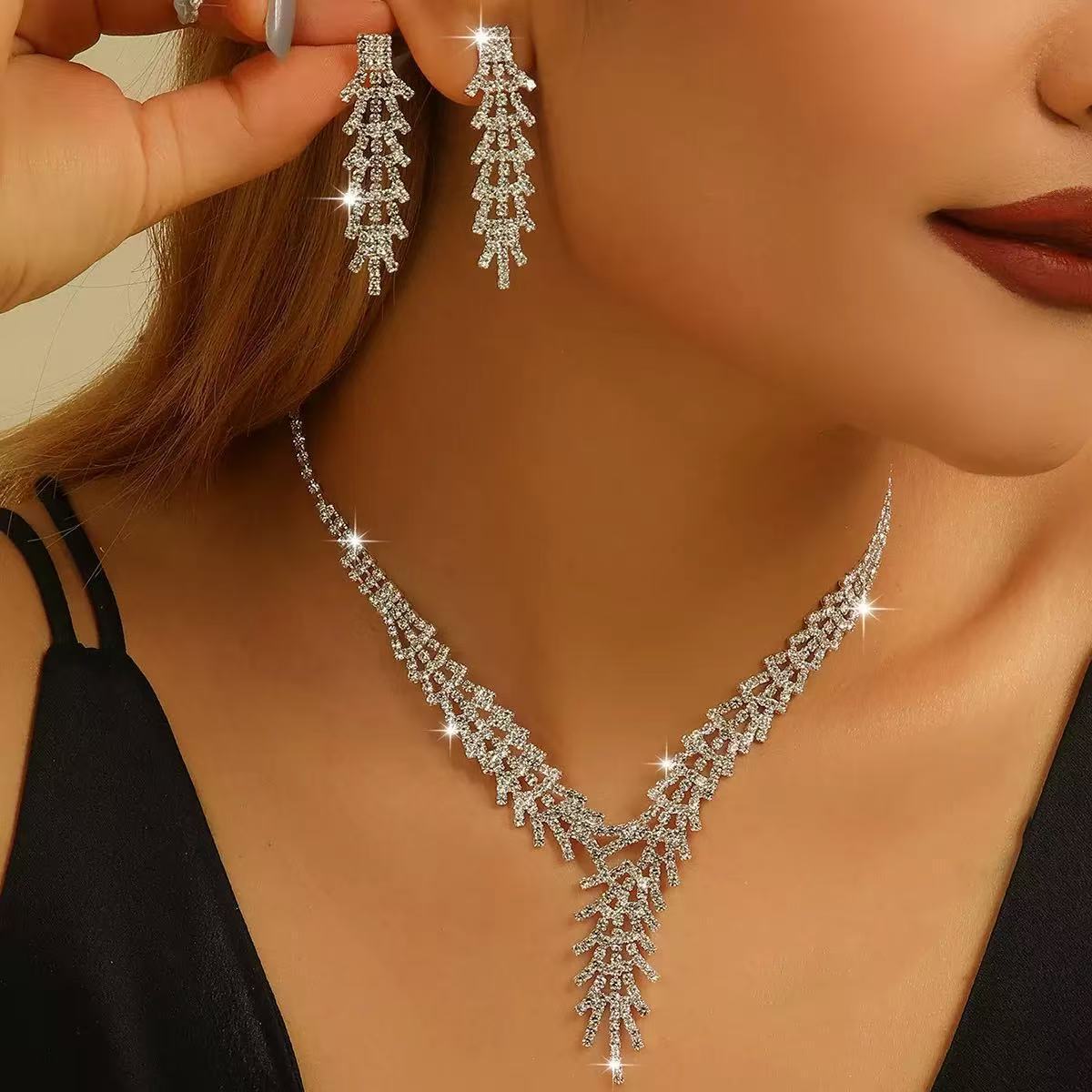 Cross-Border Korean Style Fashionable Rhinestone Sparkling Exquisite Necklace and Earrings Two-Piece Set Bridal Banquet Dress Accessories Light Luxury