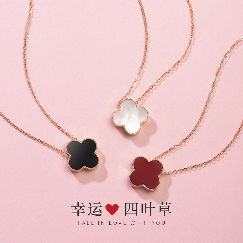 S999 Foot Silver Agate Lucky Four-leaf Clover Necklace Women's High-end Double-sided Wear Flower Shell Pendant for Girlfriend