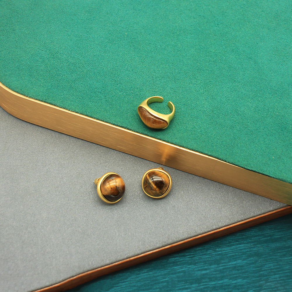 Autumn and Winter New Retro Maillard Tiger Eye Stone Ring Earrings Set Niche Design High-End Second-Hand Jewelry