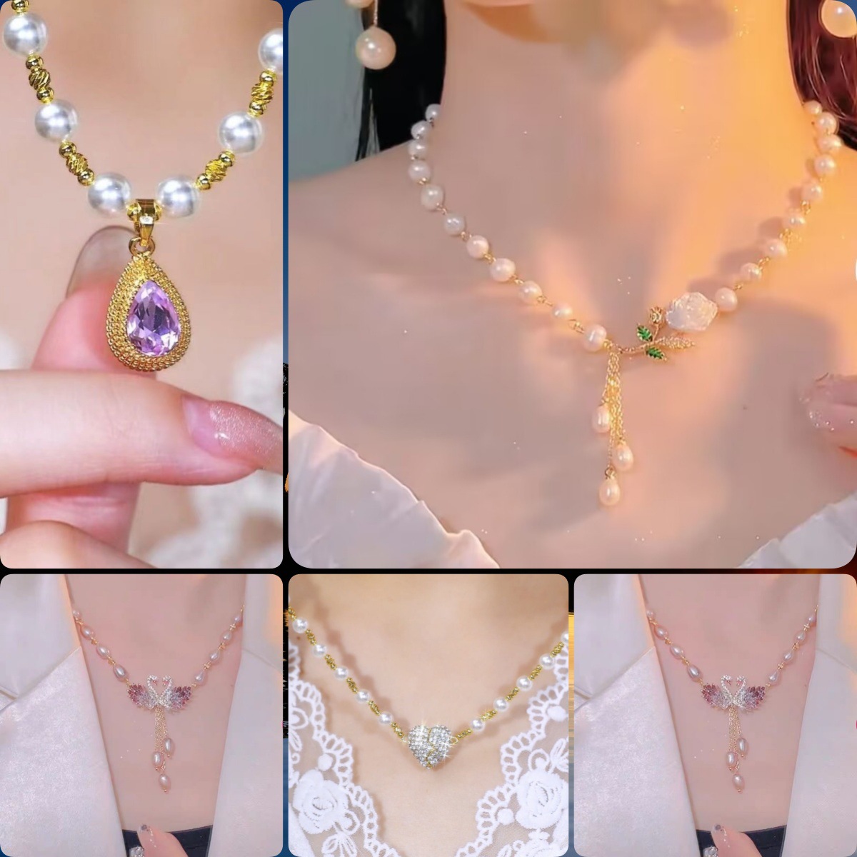 Trendy Rotating Pearl Necklace for Women with Butterfly Flower and Lotus Pendant, Clavicle Chain, Camellia Sweater Chain, Fashion Accessory