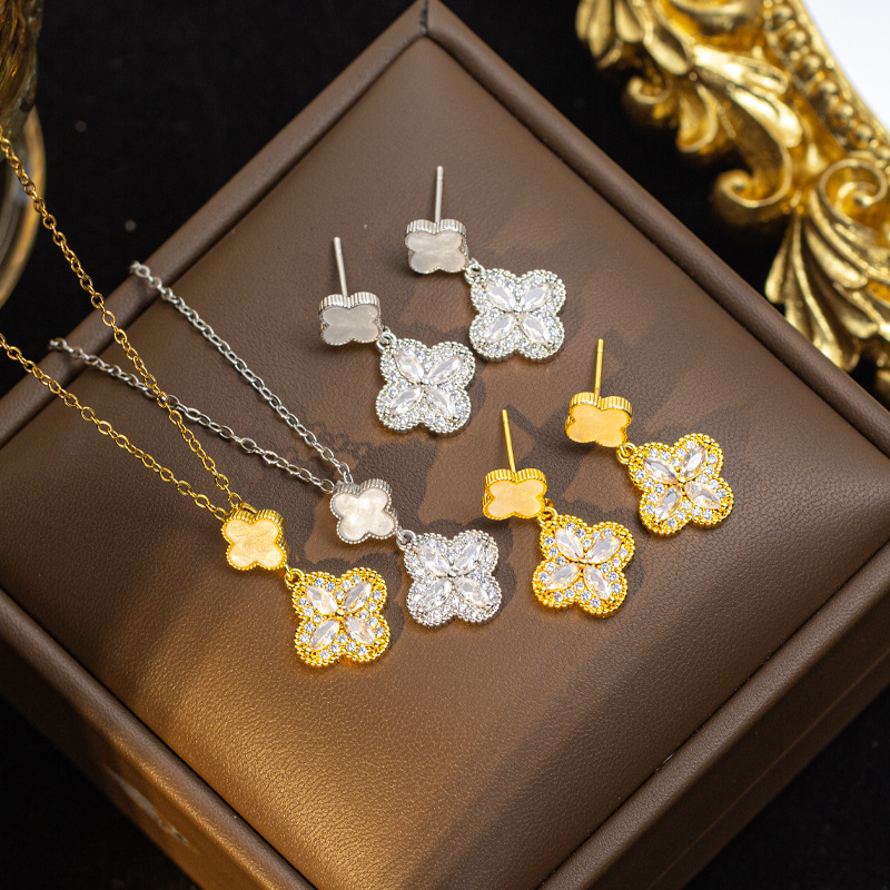 Fashionable and Simple Four-Leaf Clover Inlaid Zircon Necklace Titanium Steel Versatile Titanium Steel Flower Bracelet Girls Non-Fading Jewelry