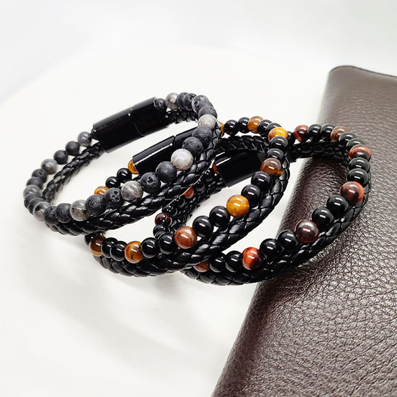 Cross-Border Exclusive Volcanic Tiger Eye Beaded Bracelet Natural Stone Leather Rope Alloy Magnet Buckle Bracelet Braided Multi-Layer Bracelet