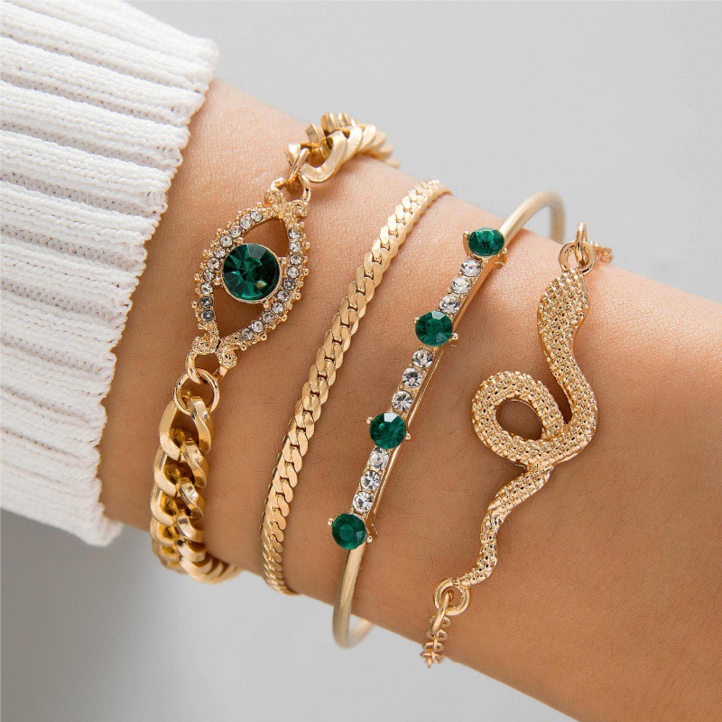 Cross-border Jewelry Fashion Niche Diamond-encrusted Green-eyed Gemstone Bracelet Set Personalized Snake-shaped Open Bracelet Four-piece Set for Women