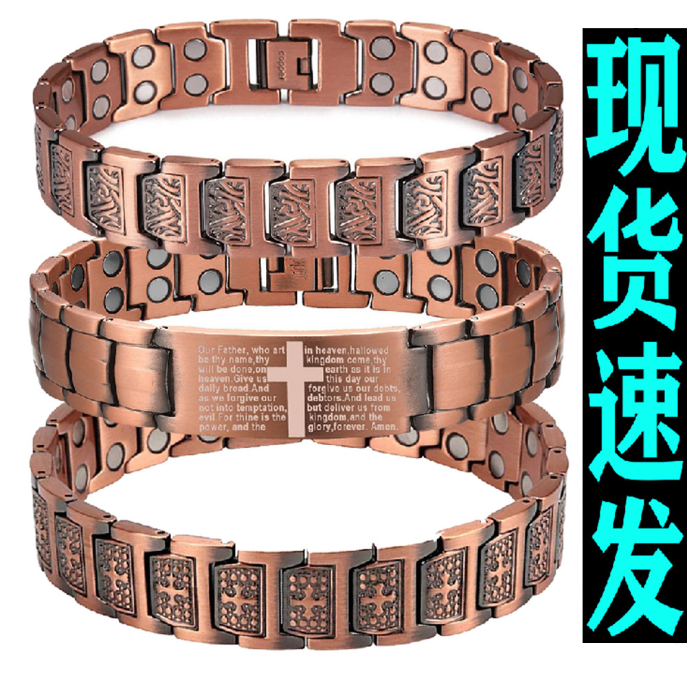 Cross-Border Hot Selling Ancient Red Copper Bracelet Finely Carved Cross-Shaped Texture Full Magnet Couple Bracelet Wholesale