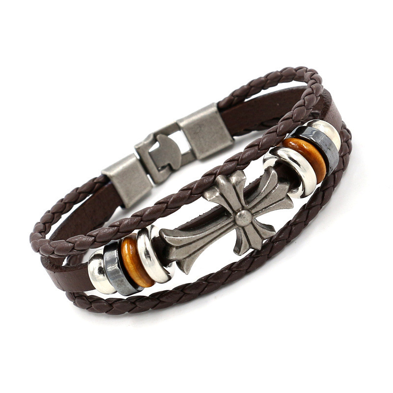 European and American foreign trade export jewelry new pair buckle leather bracelet vintage alloy cross woven cowhide bracelet