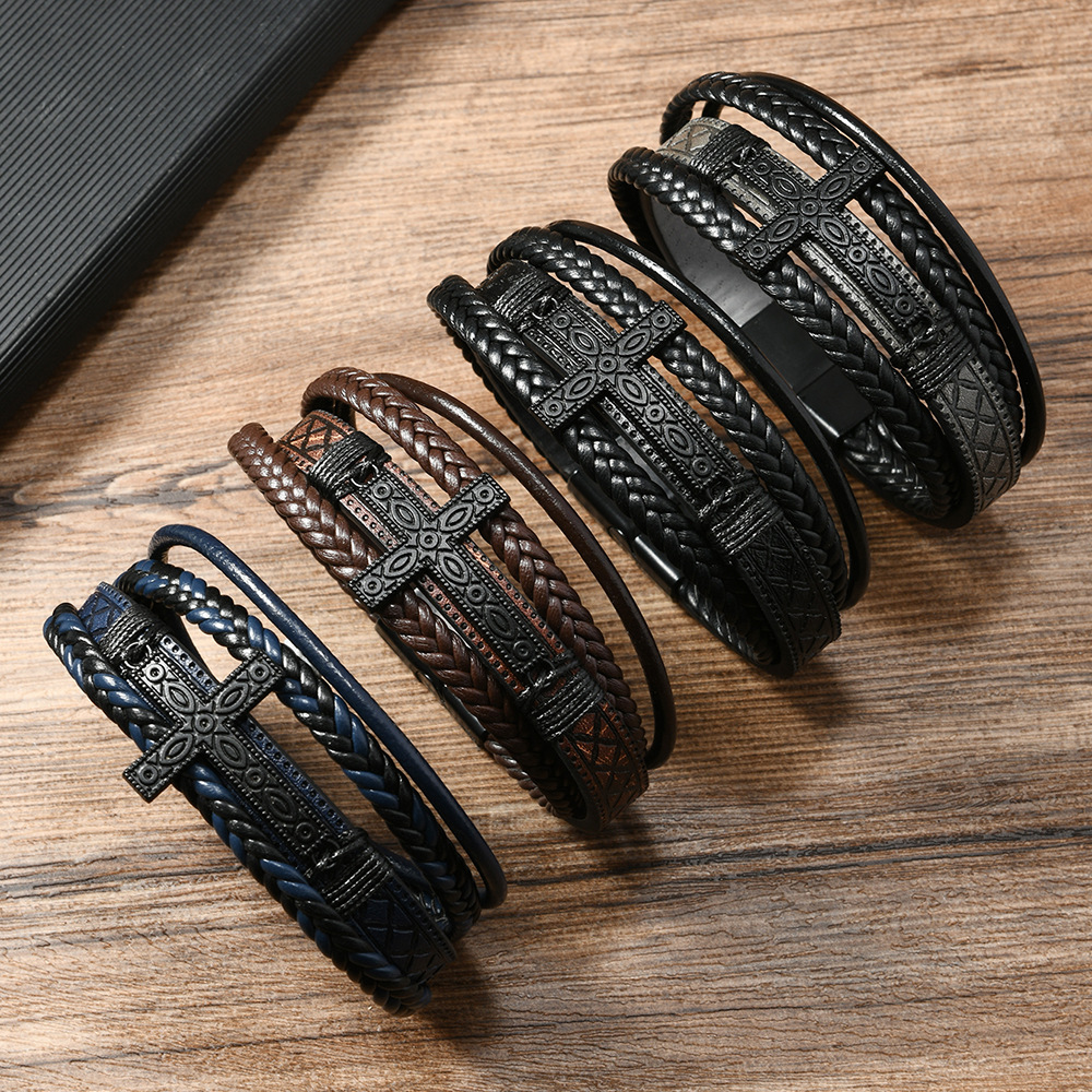 New cross-border European and American men's hand-woven fashion retro alloy cross accessories magnetic buckle leather bracelet