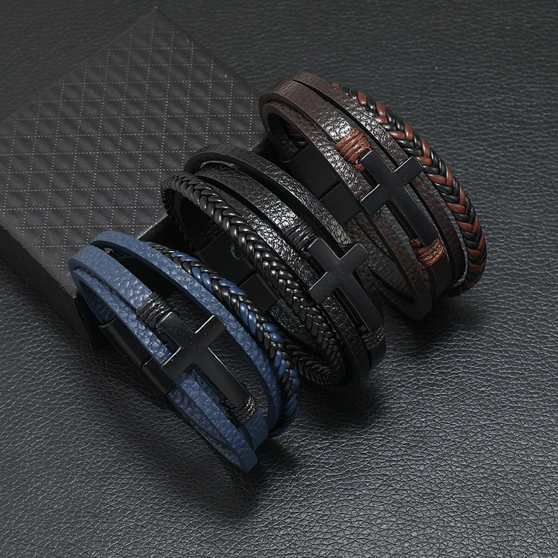 Explosive Bracelet European and American Alloy Bracelet Men's Black Cross Bracelet Magnetic Buckle Multi-layer Simple Woven Leather