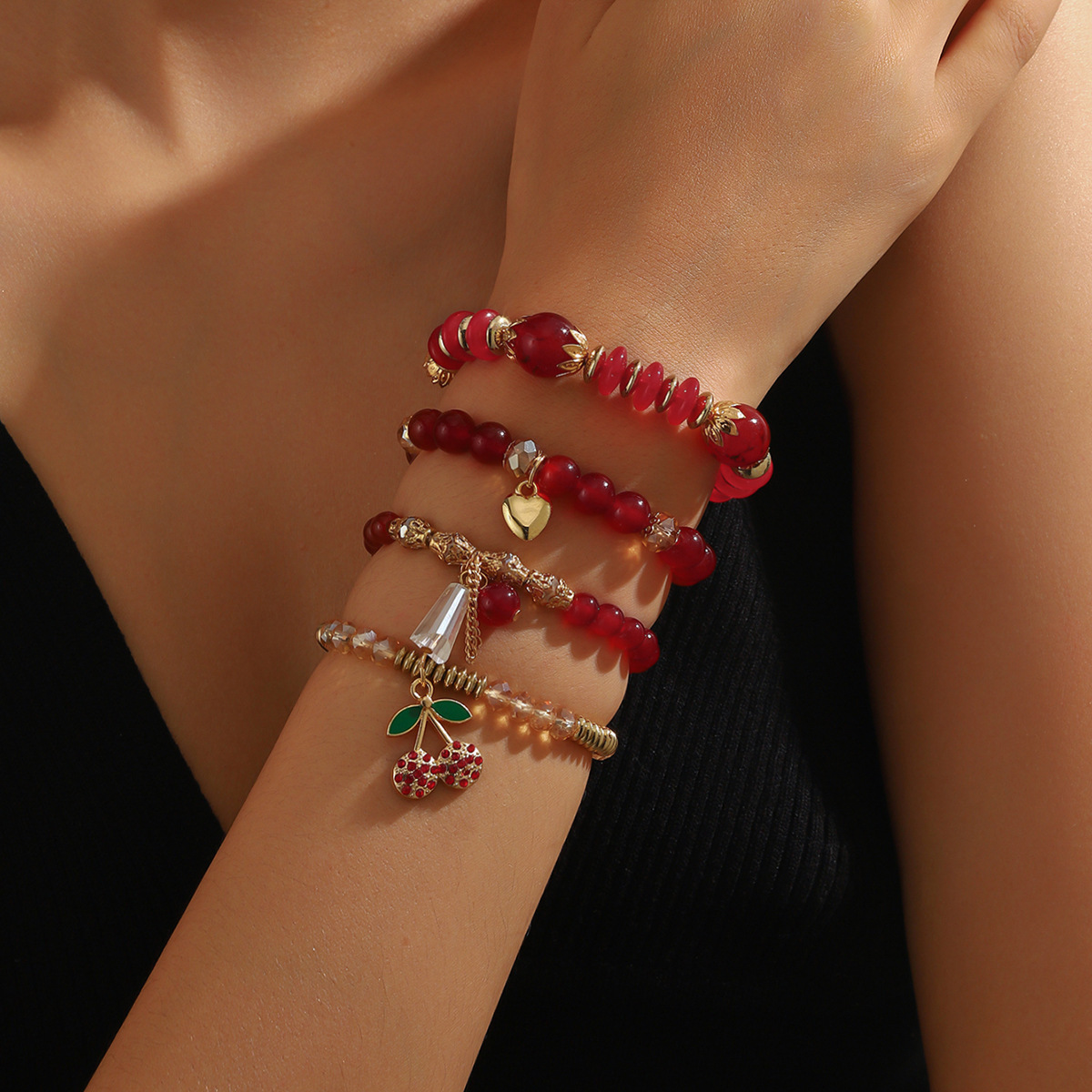 European and American Cross-Border Retro Fashion Versatile Rhinestone Cherry Heart Imitation Crystal Beaded Hand-Woven Stacked Bracelet Set