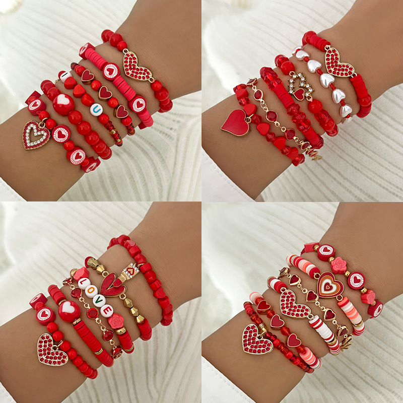 European and American Love Valentine's Day Multi-Layered Bracelet with Diamonds, Red Heart Pendant, Soft Pottery Beaded Elastic Bracelet