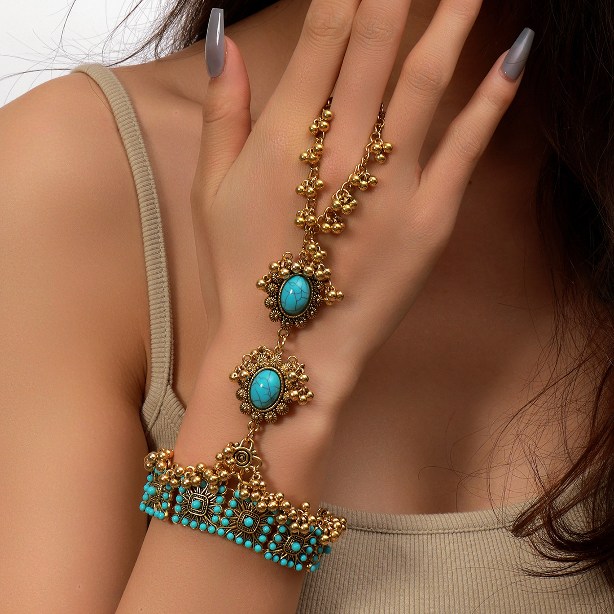 Ethnic-style Turquoise Zircon Beads Tassel Bracelet with Fingers Hetero Bohemian Vintage Personalized Bracelet for Women