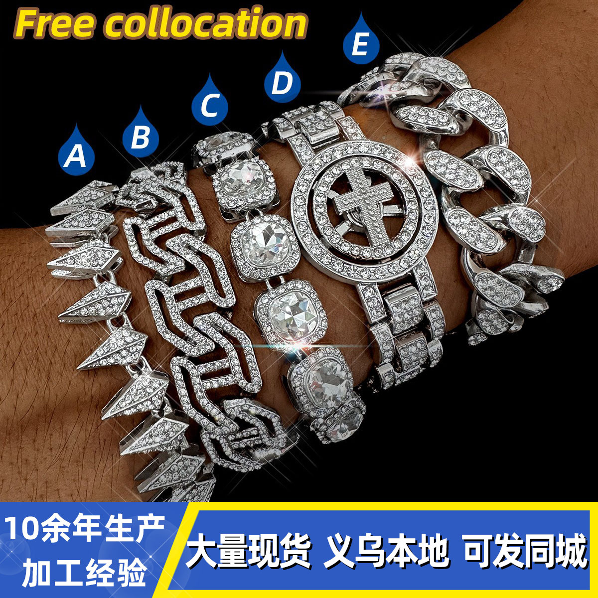 Full Diamond Cuban Chain Bracelet Set Spiked I-Shaped Alloy Rhinestone Hip-Hop Jewelry Cross-Border Exclusive for Personalized Hip-Hop