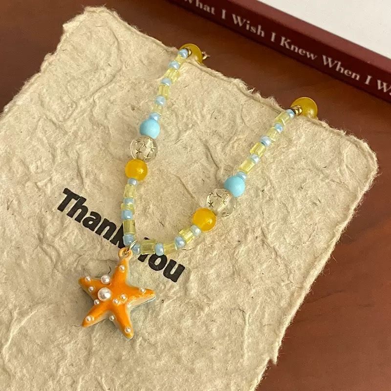 Orange Sea Under Sunset ~ Seaside Holiday Style Orange Starfish Beaded Necklace New Style Personality Sweet Niche Chain