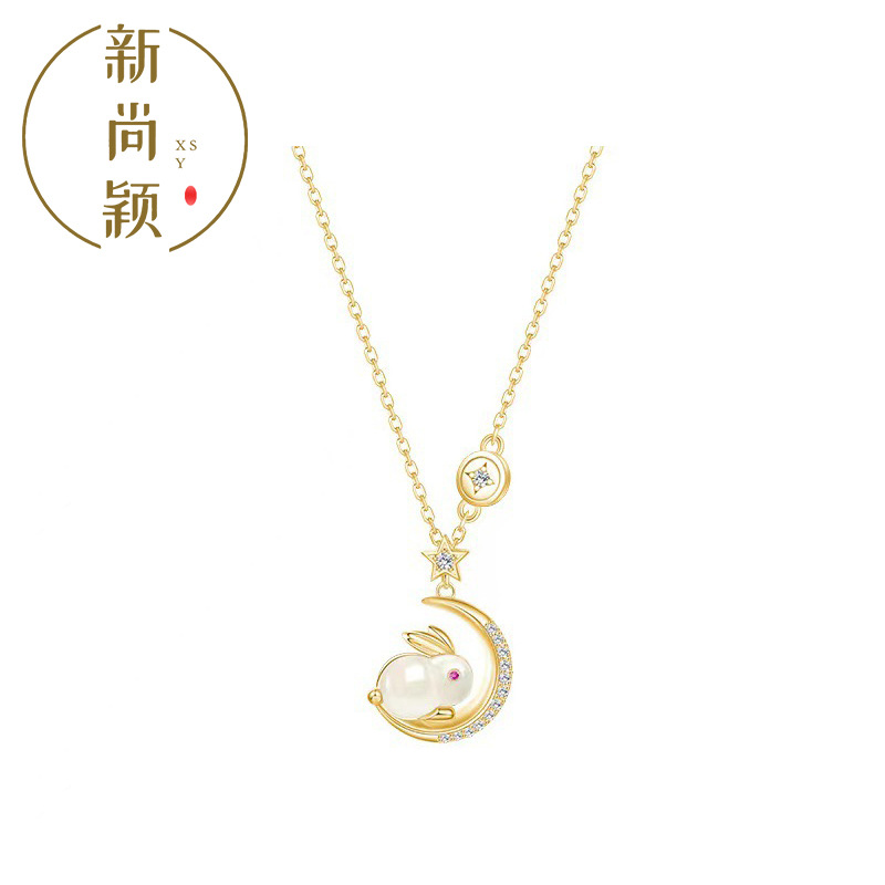 Jade Rabbit Lying Moon Star and Moon Necklace 2023 New Fashion Temperament Light Luxury Rabbit Clavicle Chain Year of the Rabbit Animal Year Gift